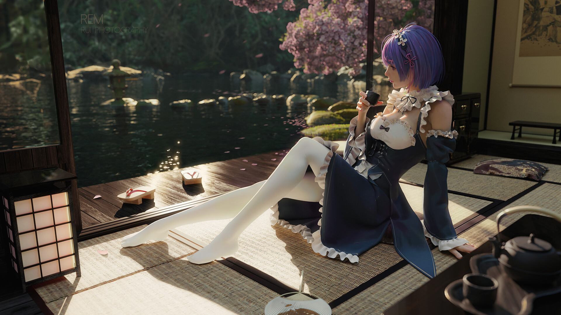 庭院 湖 女孩 裙子 白色长裤袜 草席 喝茶 动漫壁纸