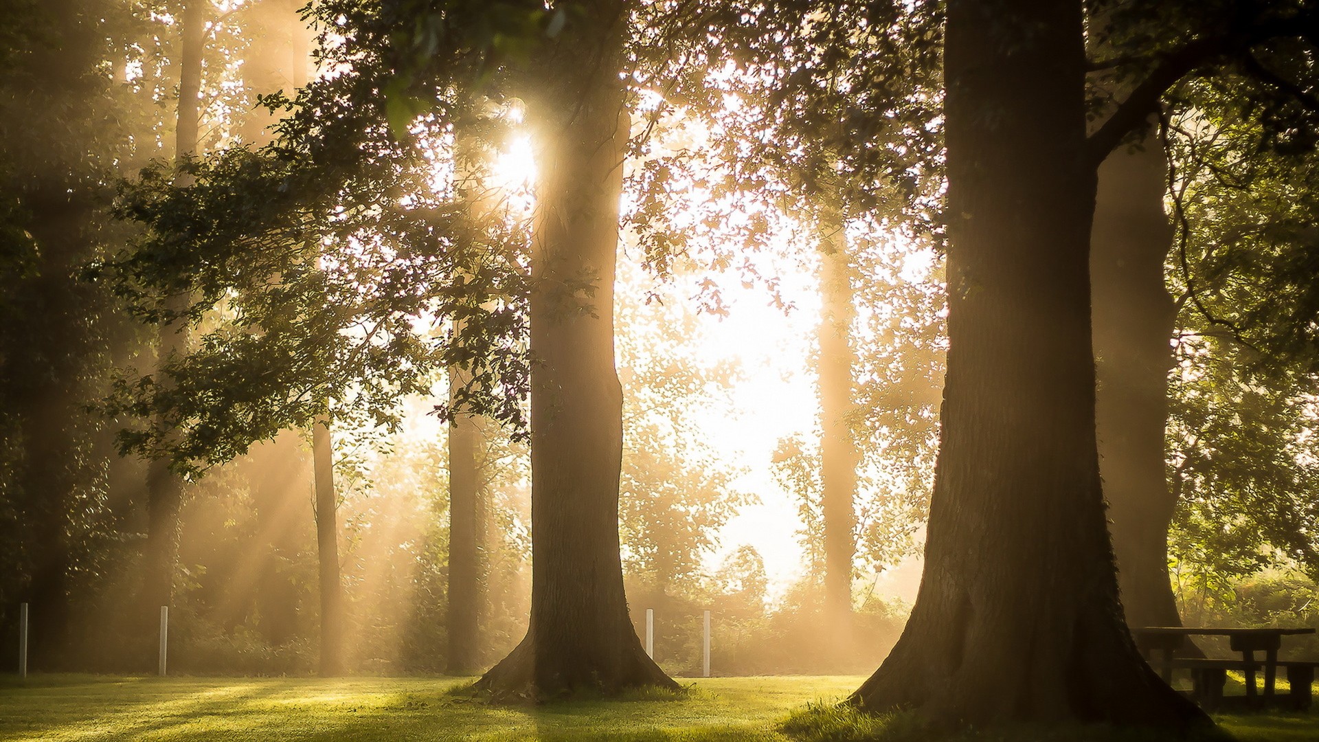 秋天公园树木旧板凳满地落叶风景免费电脑壁纸下载