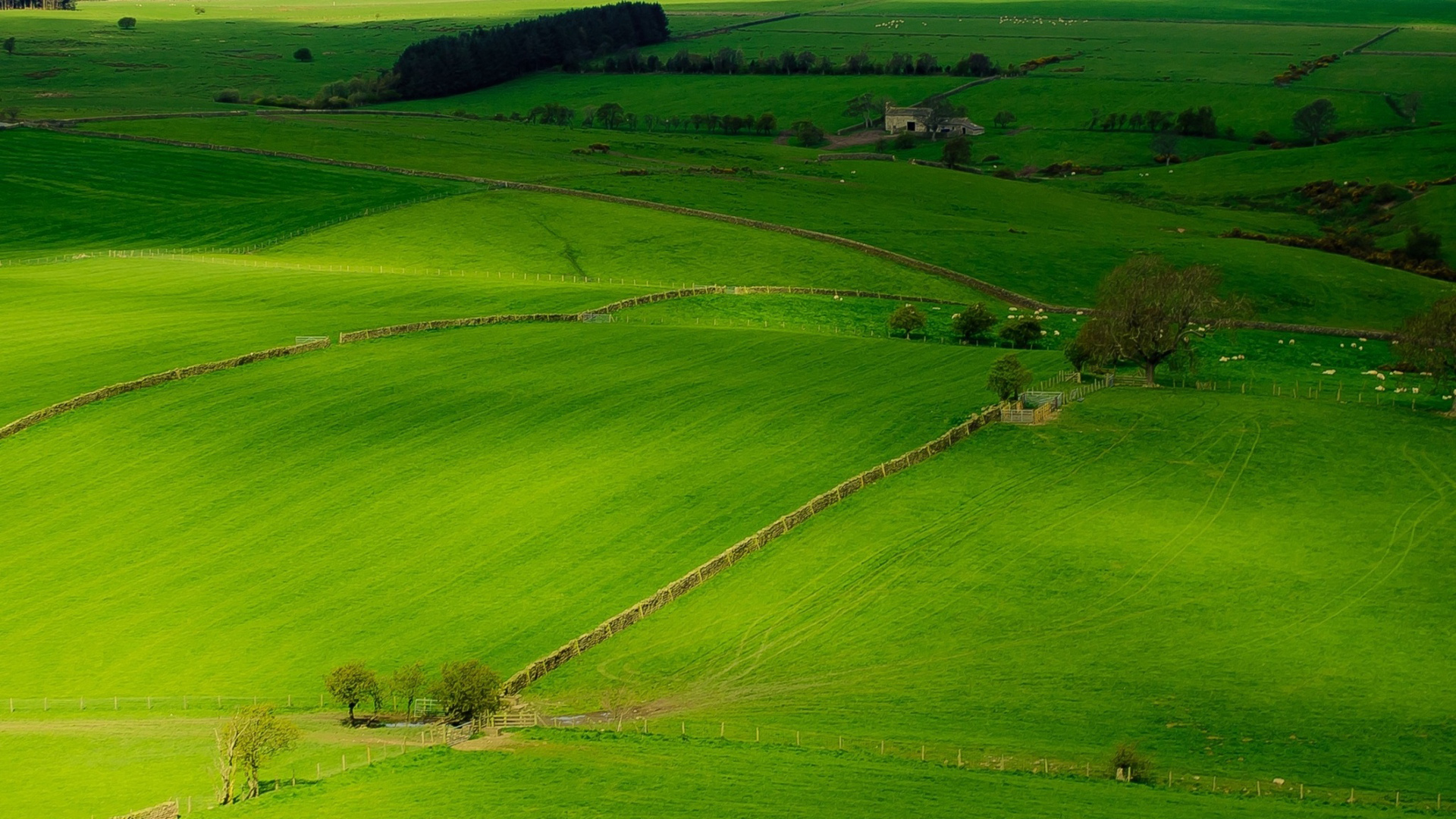 山丘田野树木房屋绿草地风景桌面壁纸免费下载