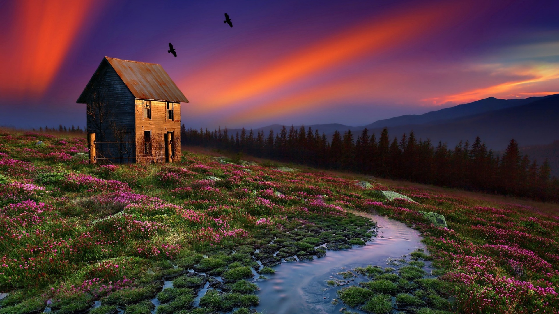 晚上游泳池边个性房子与树宽屏风景免费电脑壁纸下载