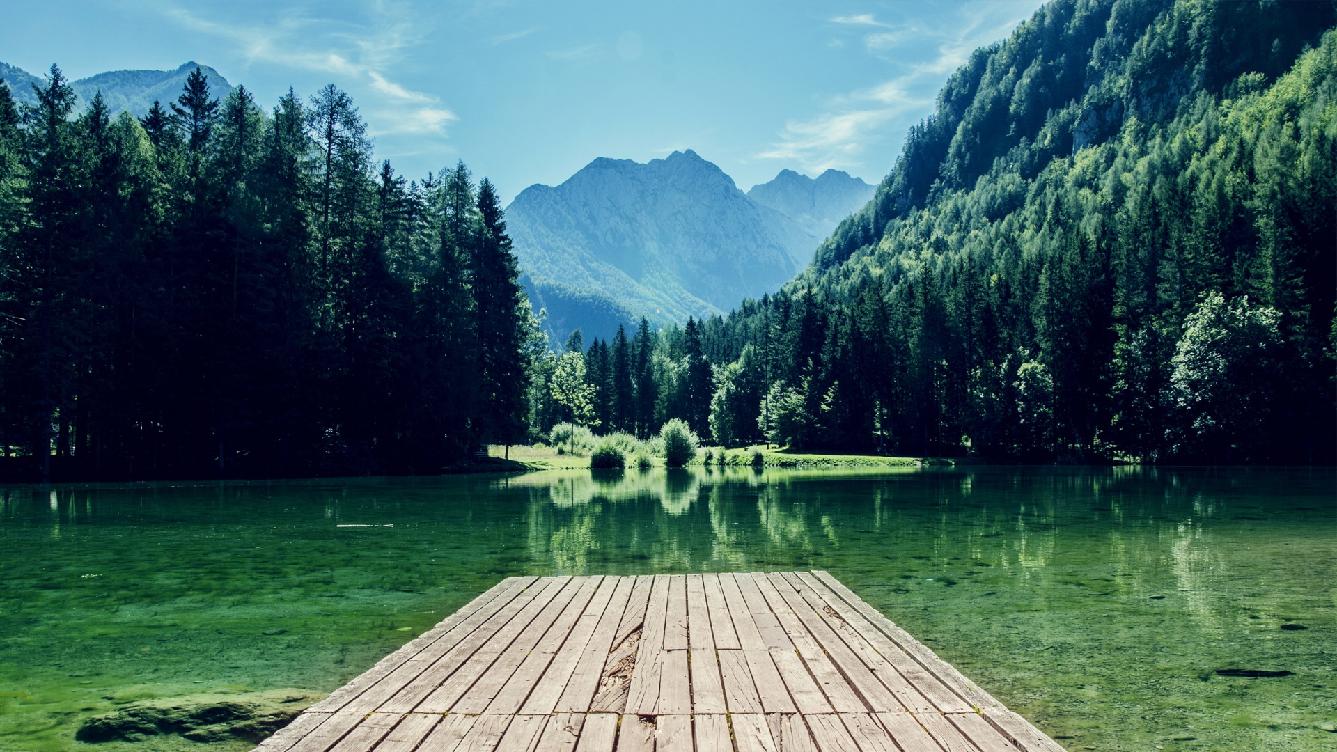 早晨小湖木栈道高山房子风景桌面壁纸免费电脑壁纸下载