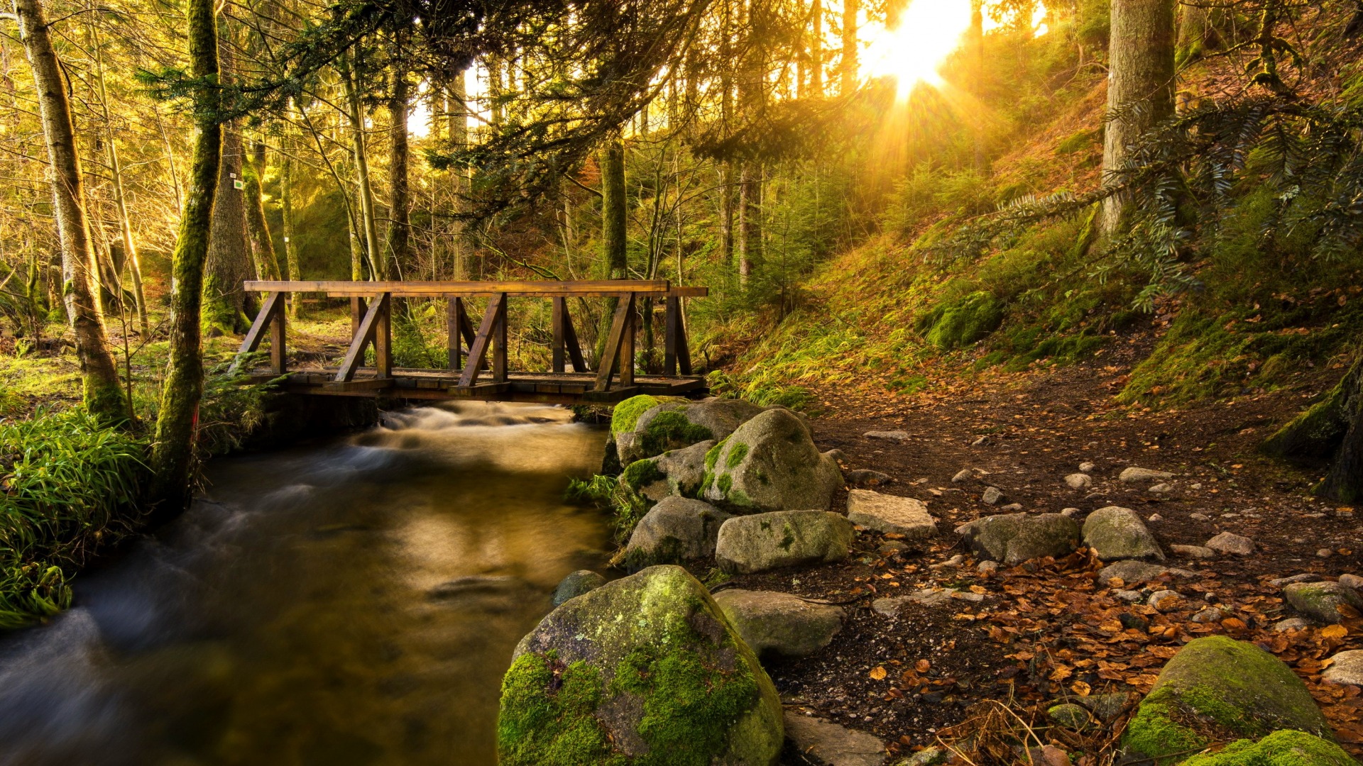 森林河流石拱桥山水倒影自然风景免费电脑壁纸下载