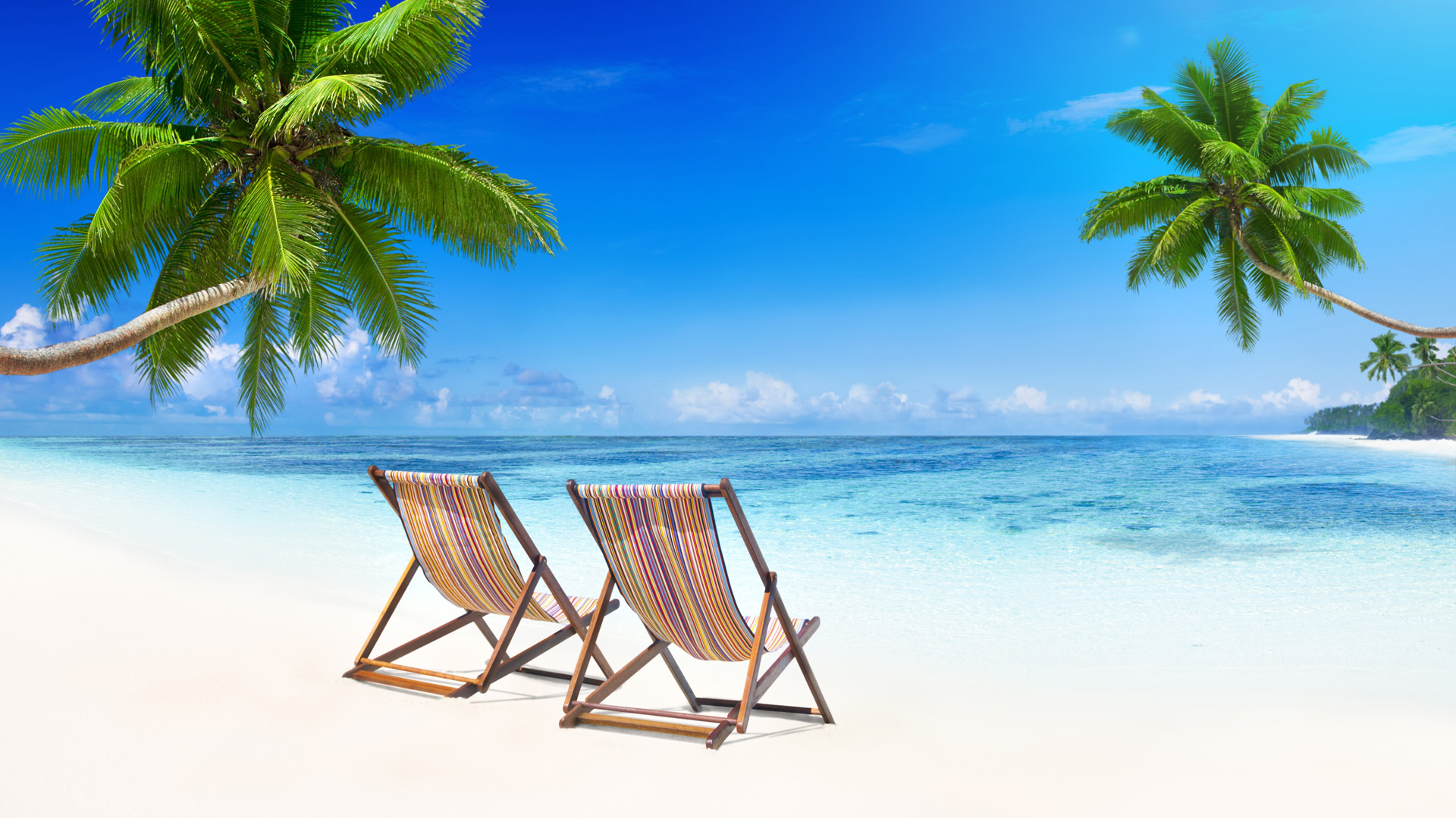 小岛3D风景壁纸,房子、海水、树、天空与云免费电脑壁纸下载