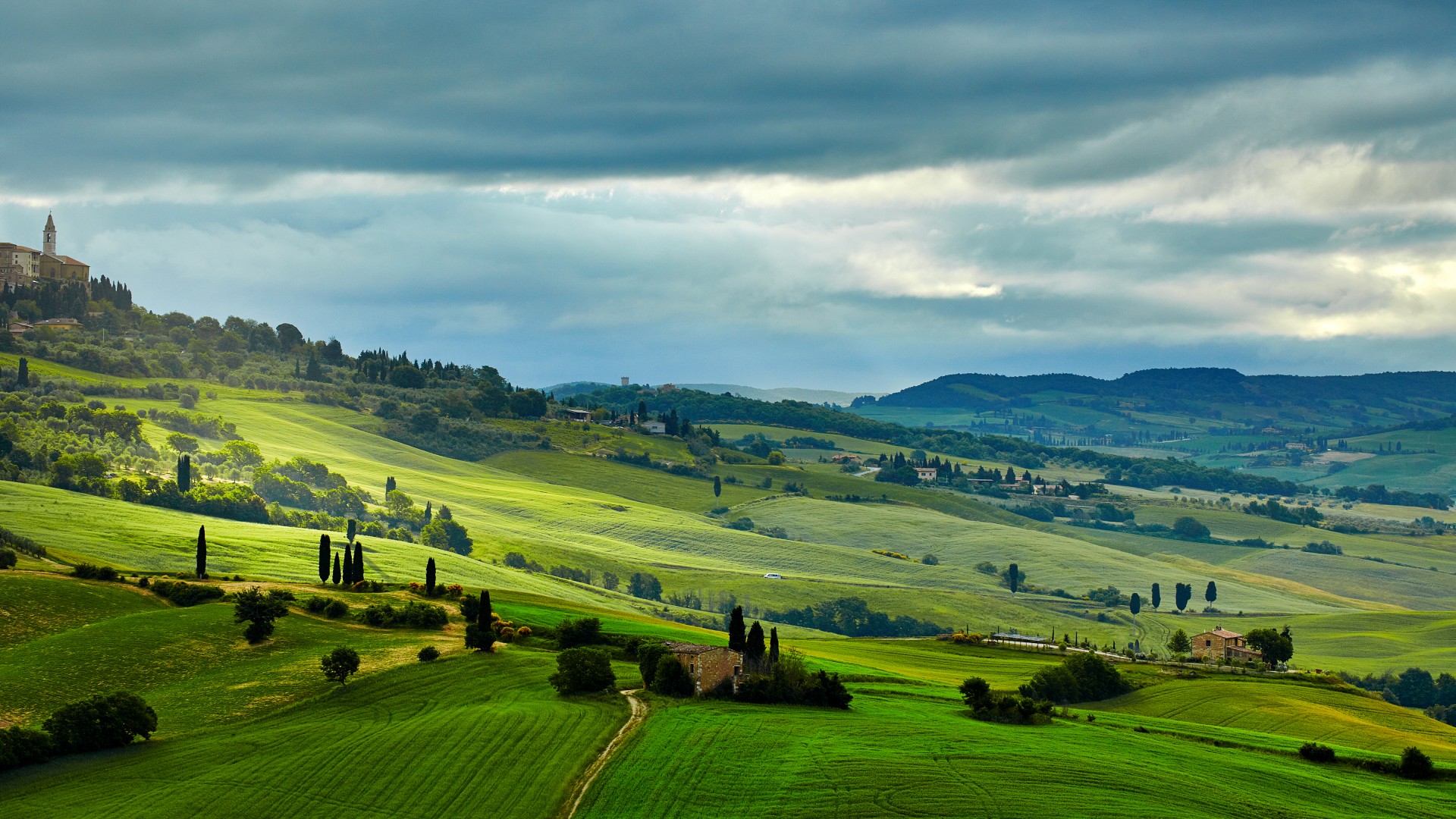 上午日出丘陵草地雾树风景桌面壁纸免费下载