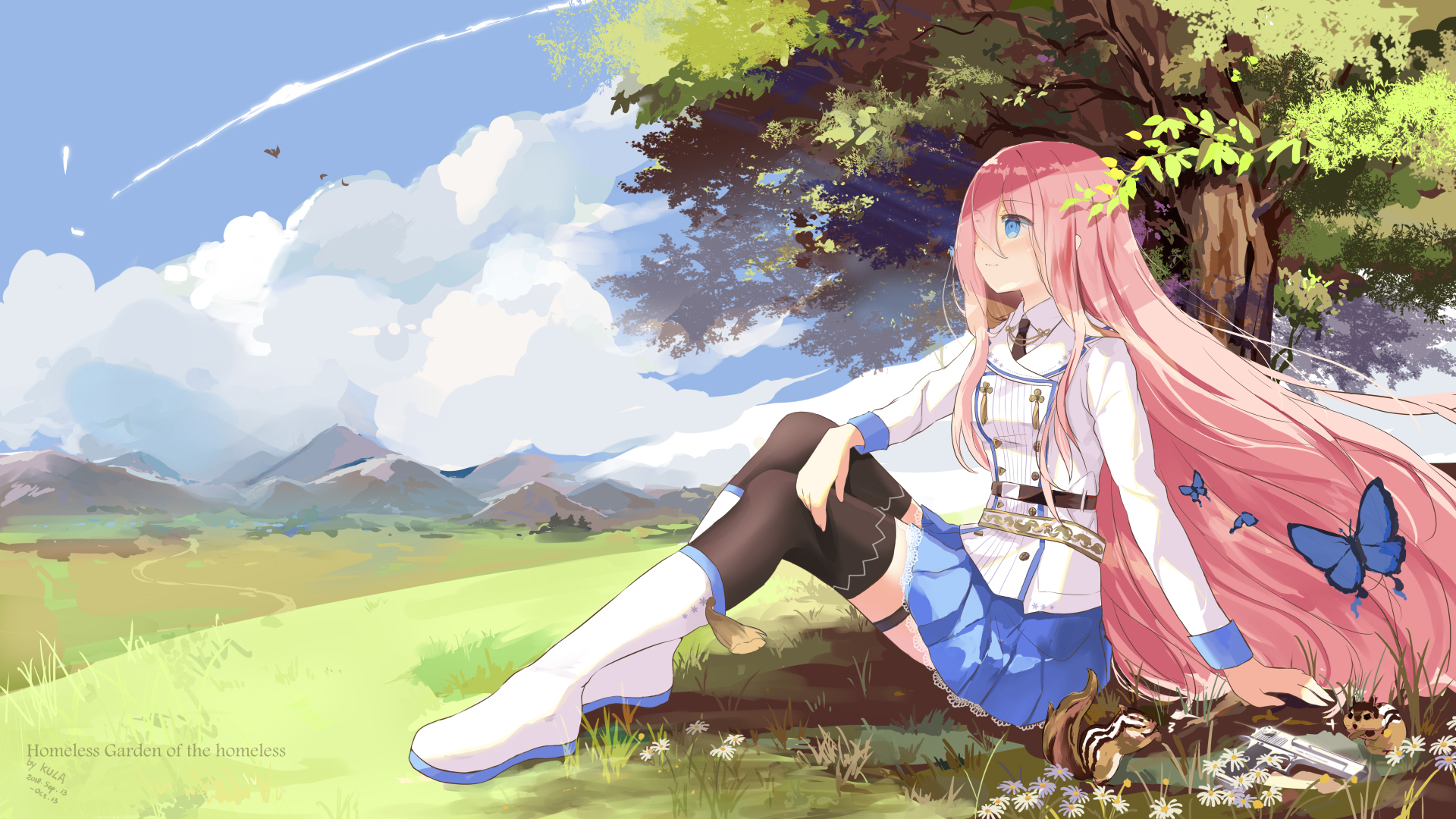 粉色长头发女子树下花园动漫免费电脑壁纸下载