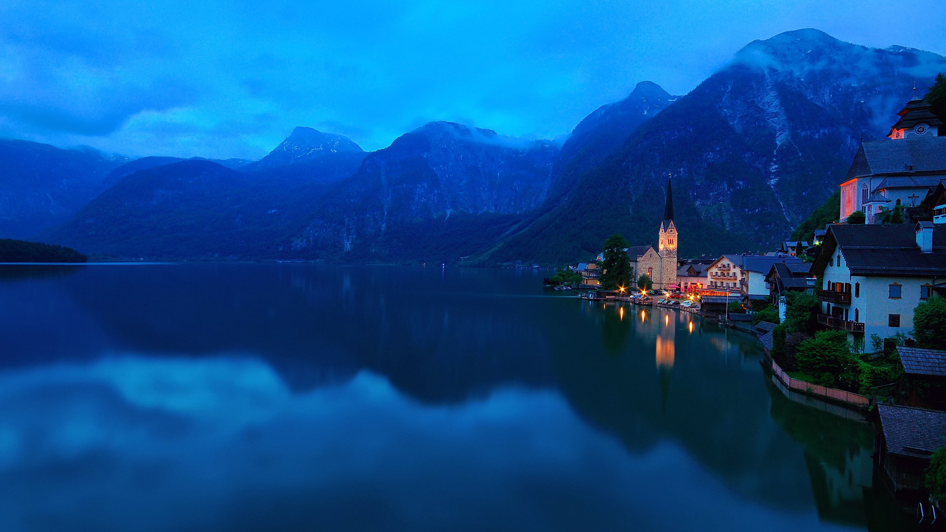 早晨山树湖房子美丽倒映自然风景免费电脑壁纸下载