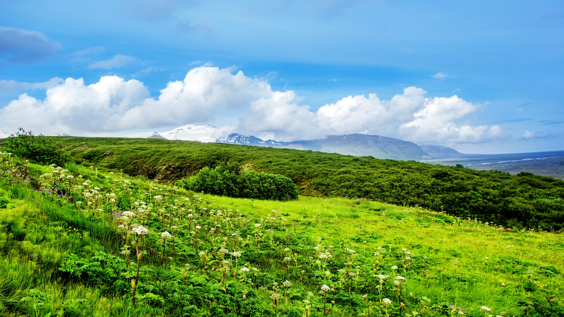 春天山森林小湖小屋花卉花草风景桌面壁纸免费下载