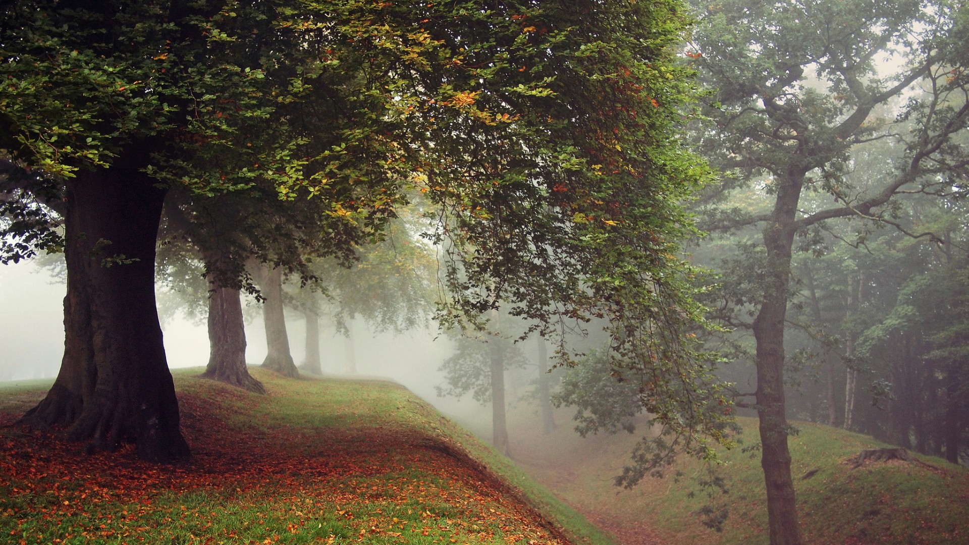 秋天颜色下的树木山丘房屋风景壁纸 免费电脑壁纸下载