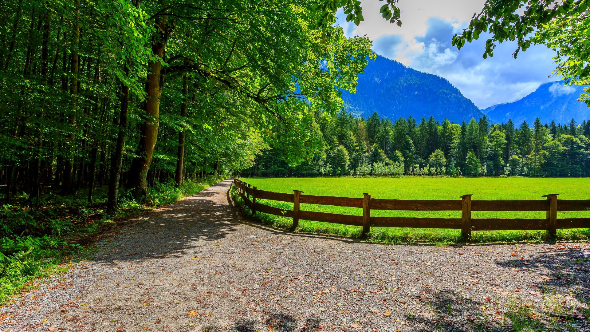 夏天自然风景免费电脑壁纸下载,树木草地长椅栅栏美景