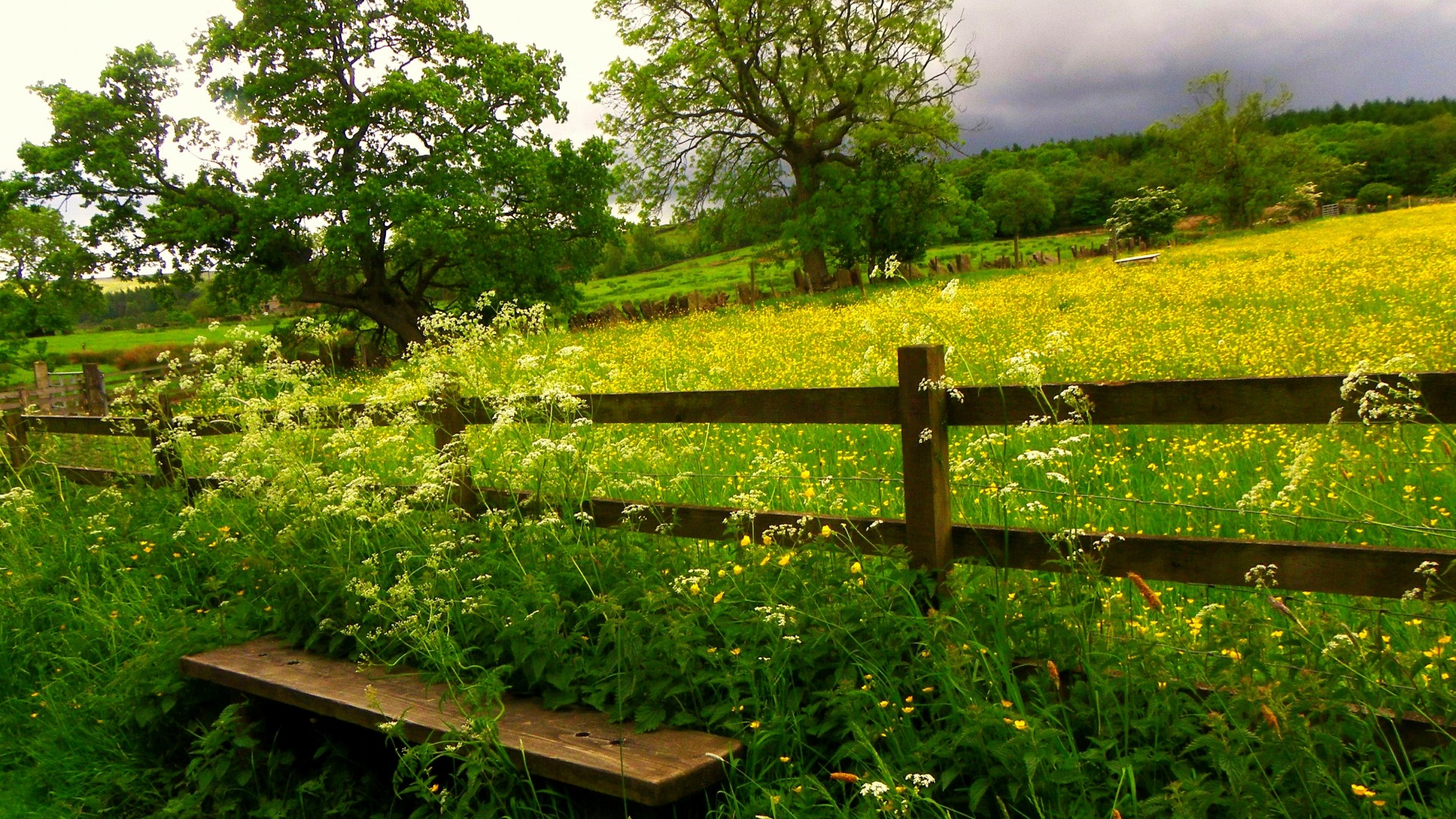 免费下载夏天花场树花蓝天白云草地电脑桌面风景壁纸