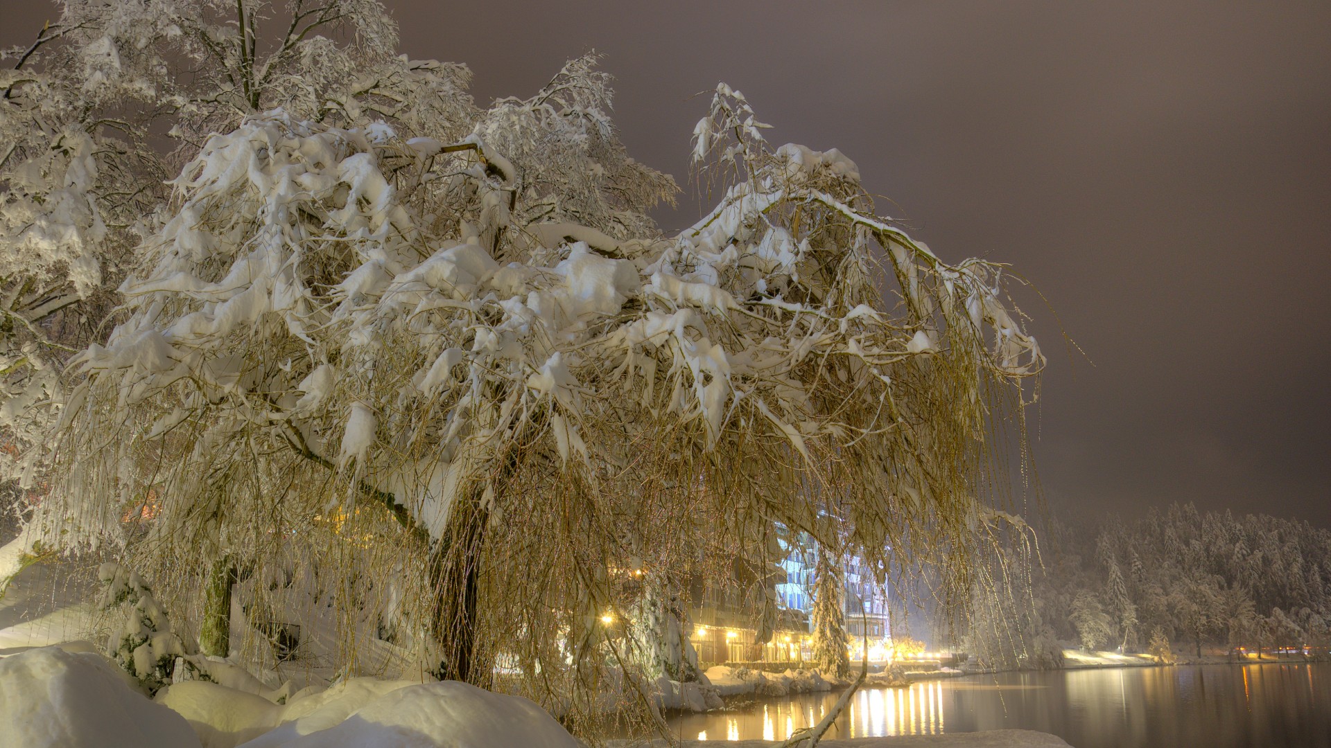 早晨雪景,冬天树与房子的绝美风景电脑壁纸免费下载