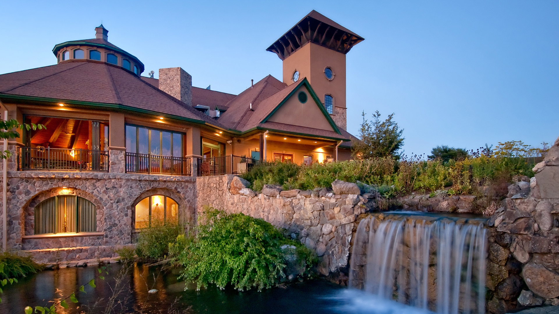 树山森林河流房子绿草地风景电脑壁纸免费下载