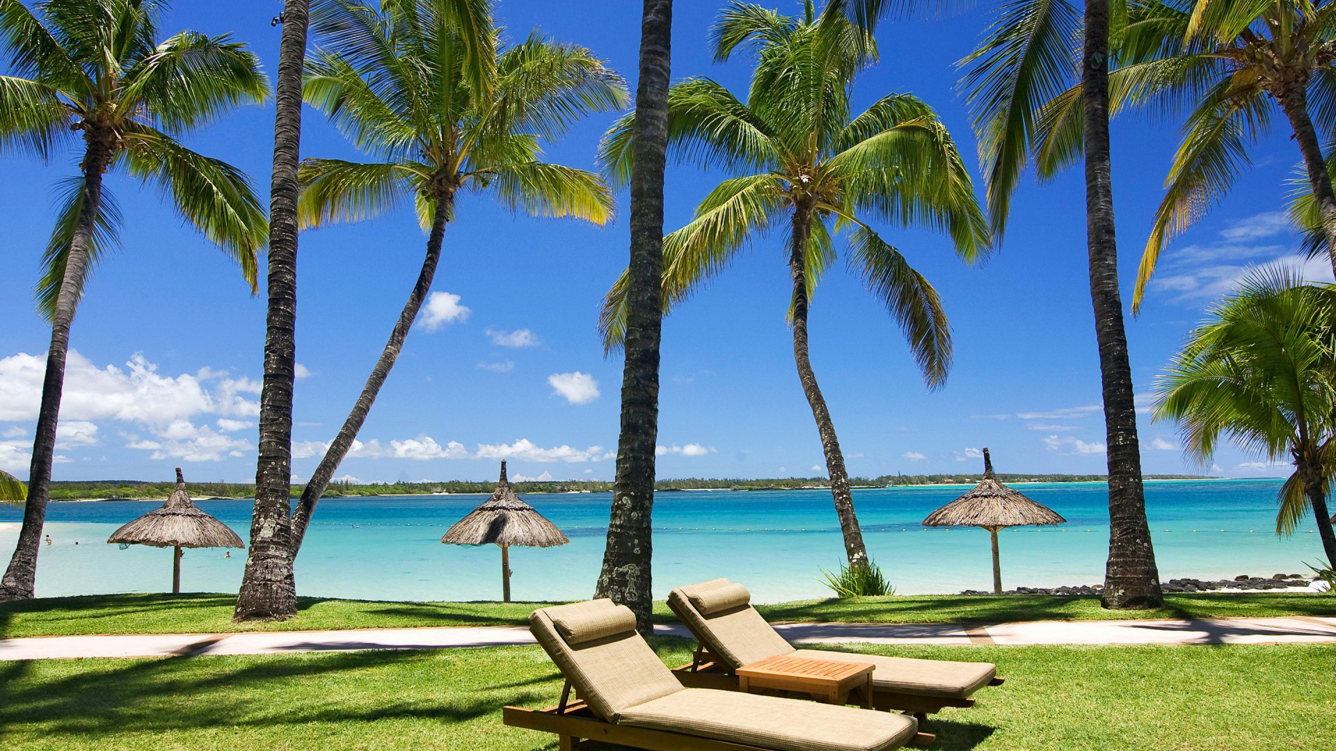蓝色海岸沙滩绿色棕榈风景桌面壁纸免费下载