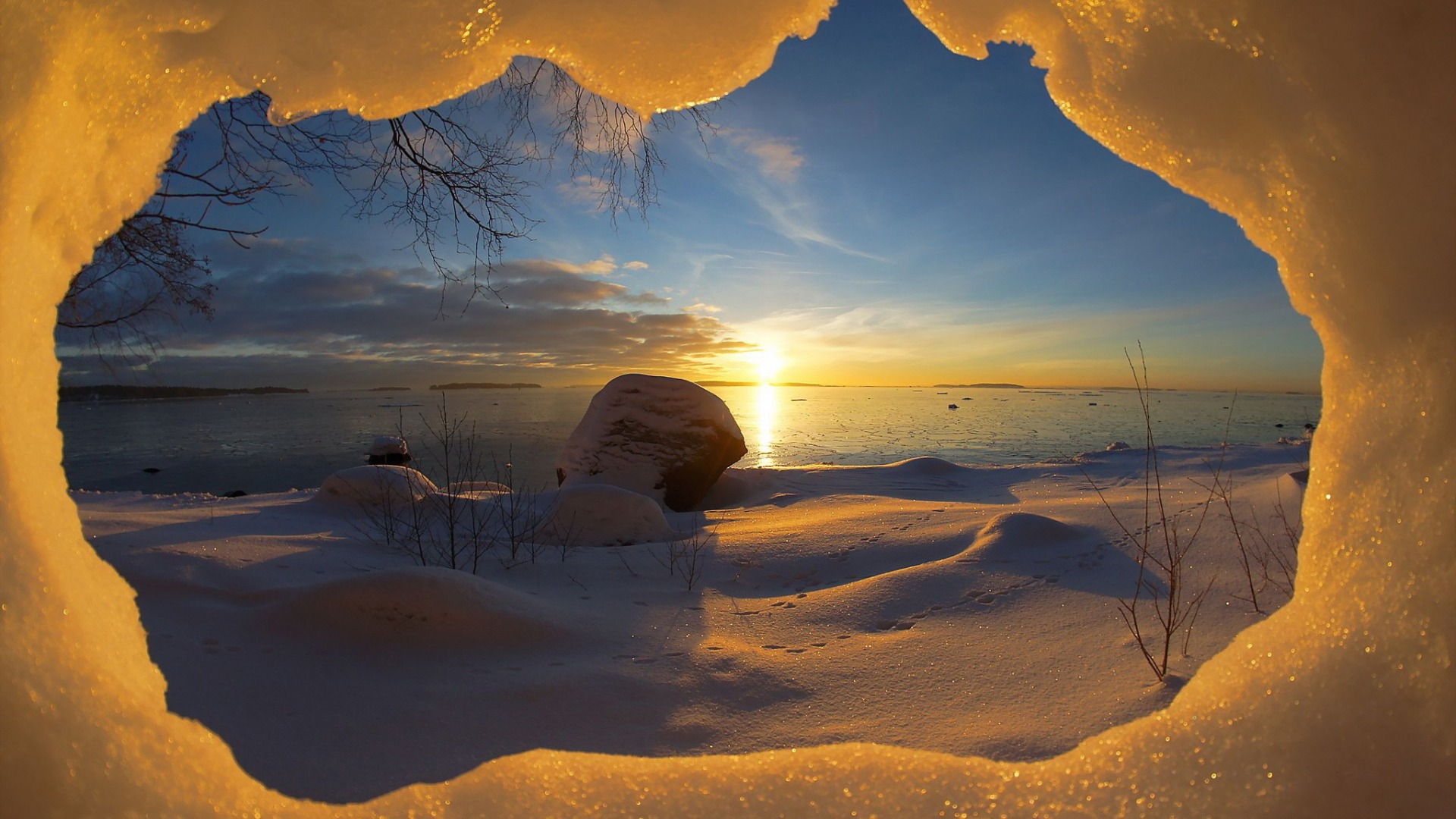 冬天山间雪景树林阳光天空 美丽免费电脑风景壁纸下载