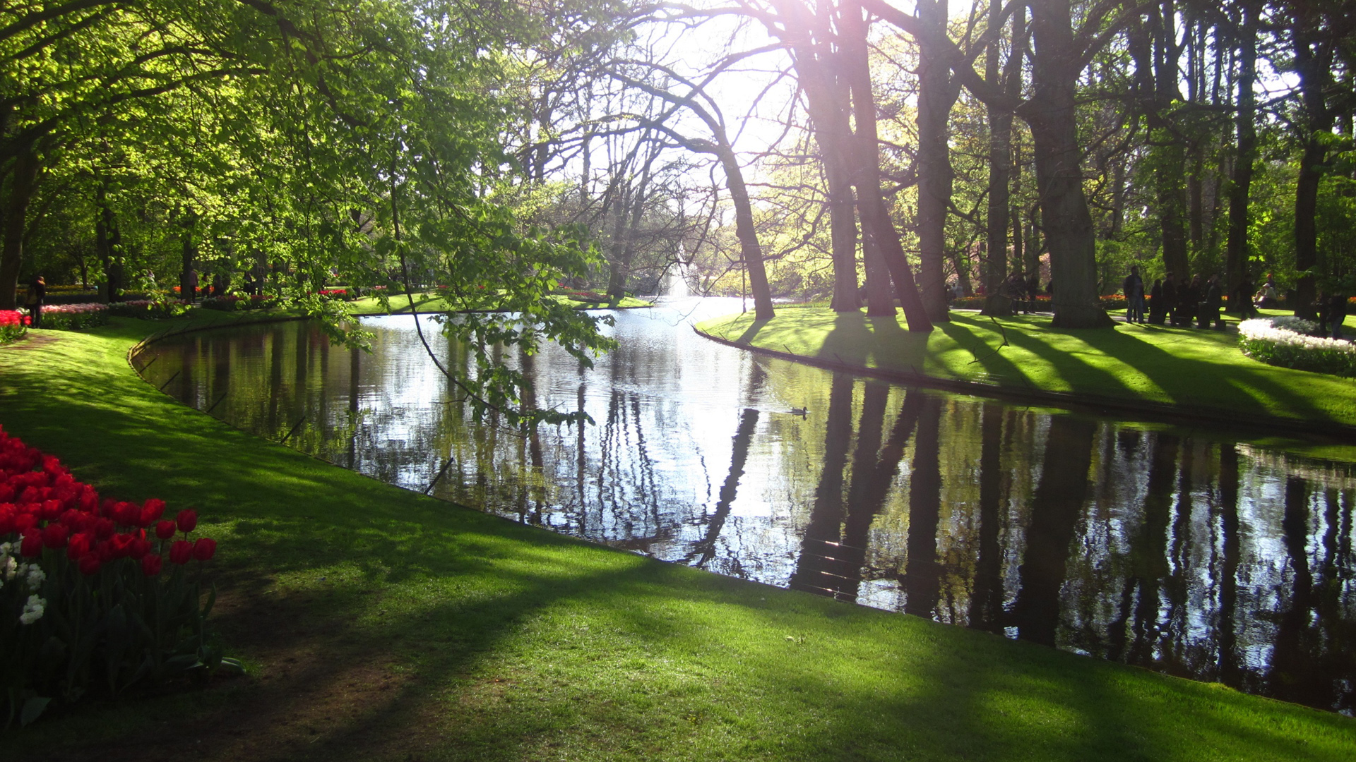 粉色花朵点缀公园树林道路绿草地自然风景免费电脑壁纸下载
