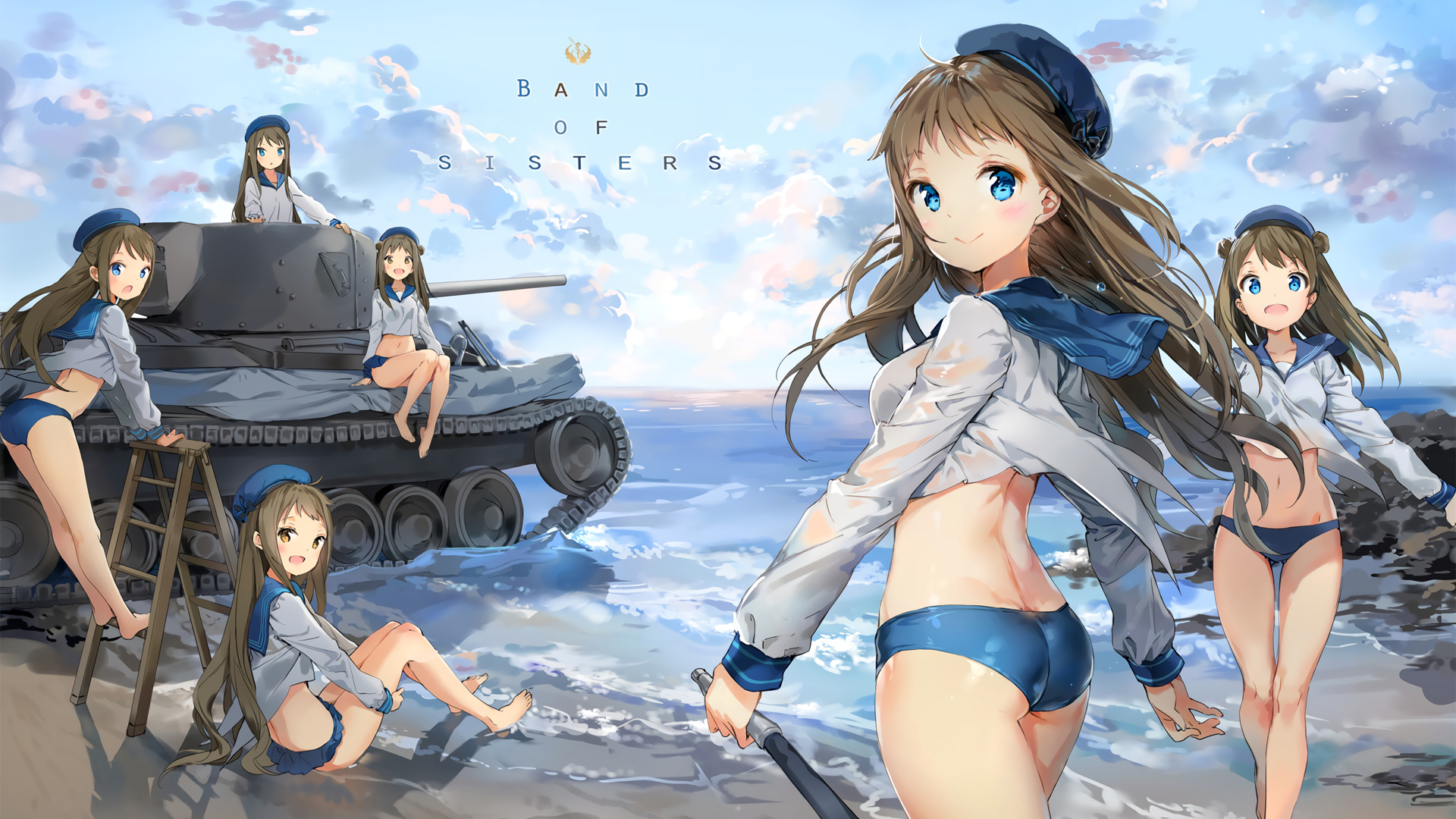 姐妹水手服泳装海边坦克主题好看动漫壁纸免费电脑下载