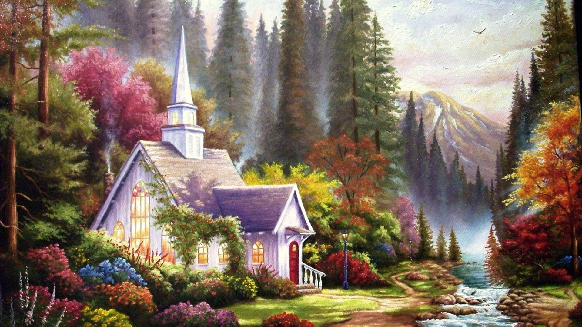 树林小屋小河-美丽秋天风景免费电脑壁纸下载