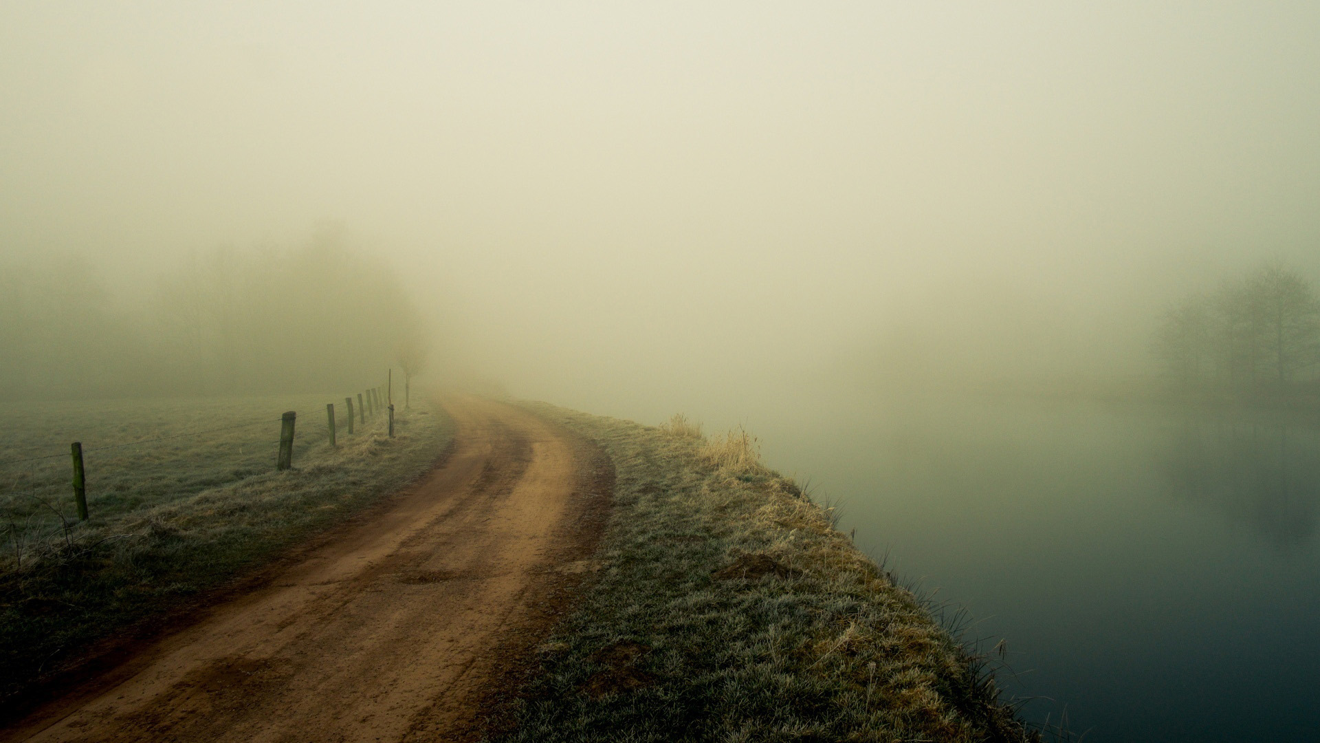 夏天早晨小巷公园雾中绿色树木护眼自然风景免费电脑壁纸下载