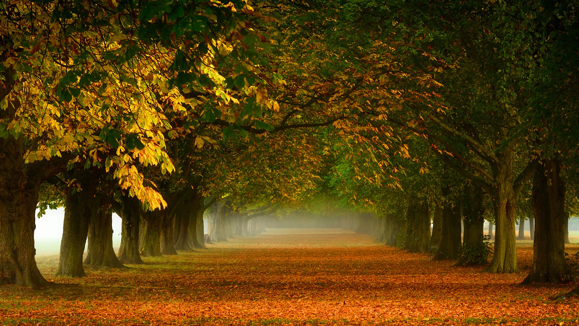 秋天森林日出自然风景公园道路树叶电脑壁纸免费下载