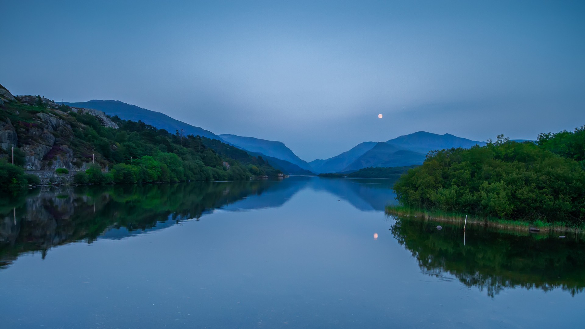 湖光山色日落月升 水蓝色风景免费电脑壁纸下载
