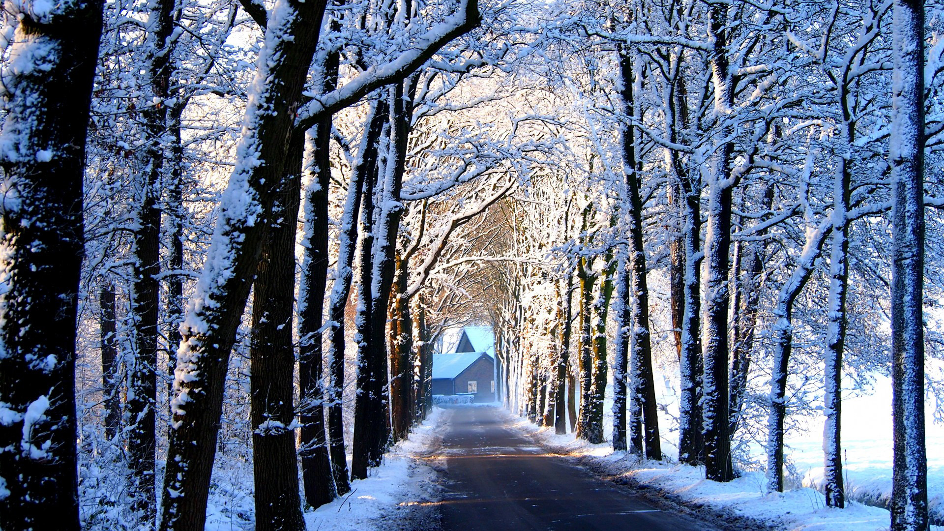 冬天雪覆天空下树林路自然风景免费电脑壁纸下载