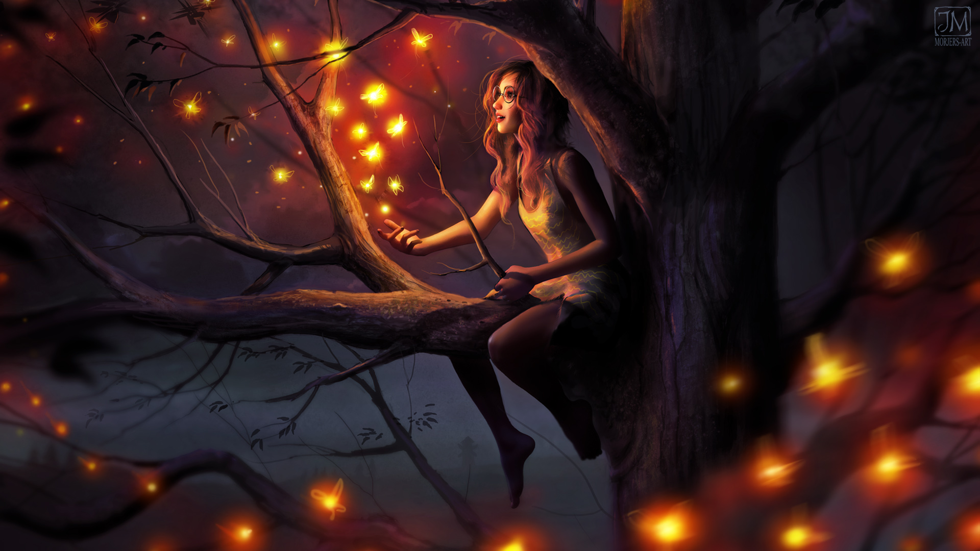 晚上树上女孩与蝴蝶魔法唯美动漫电脑壁纸免费下载