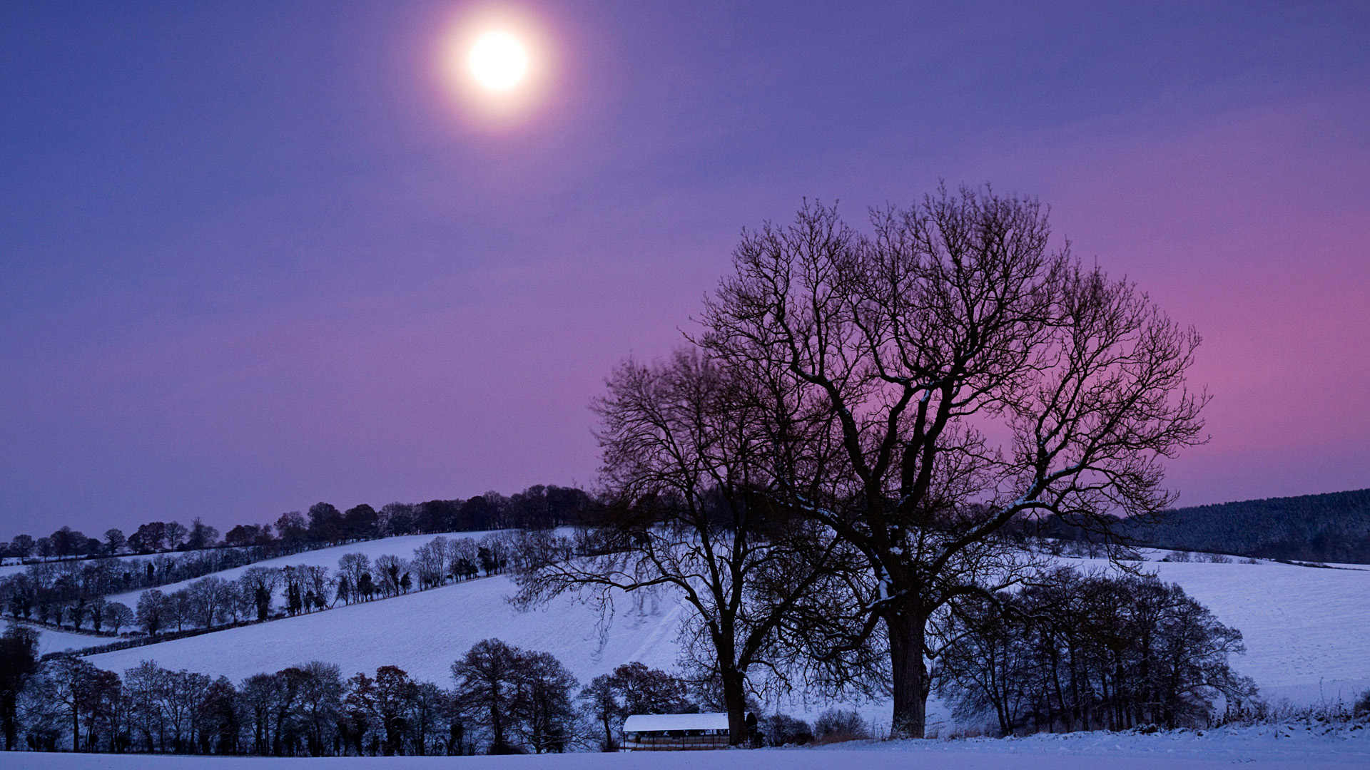 冬天晚上田野树木雪景免费电脑壁纸下载