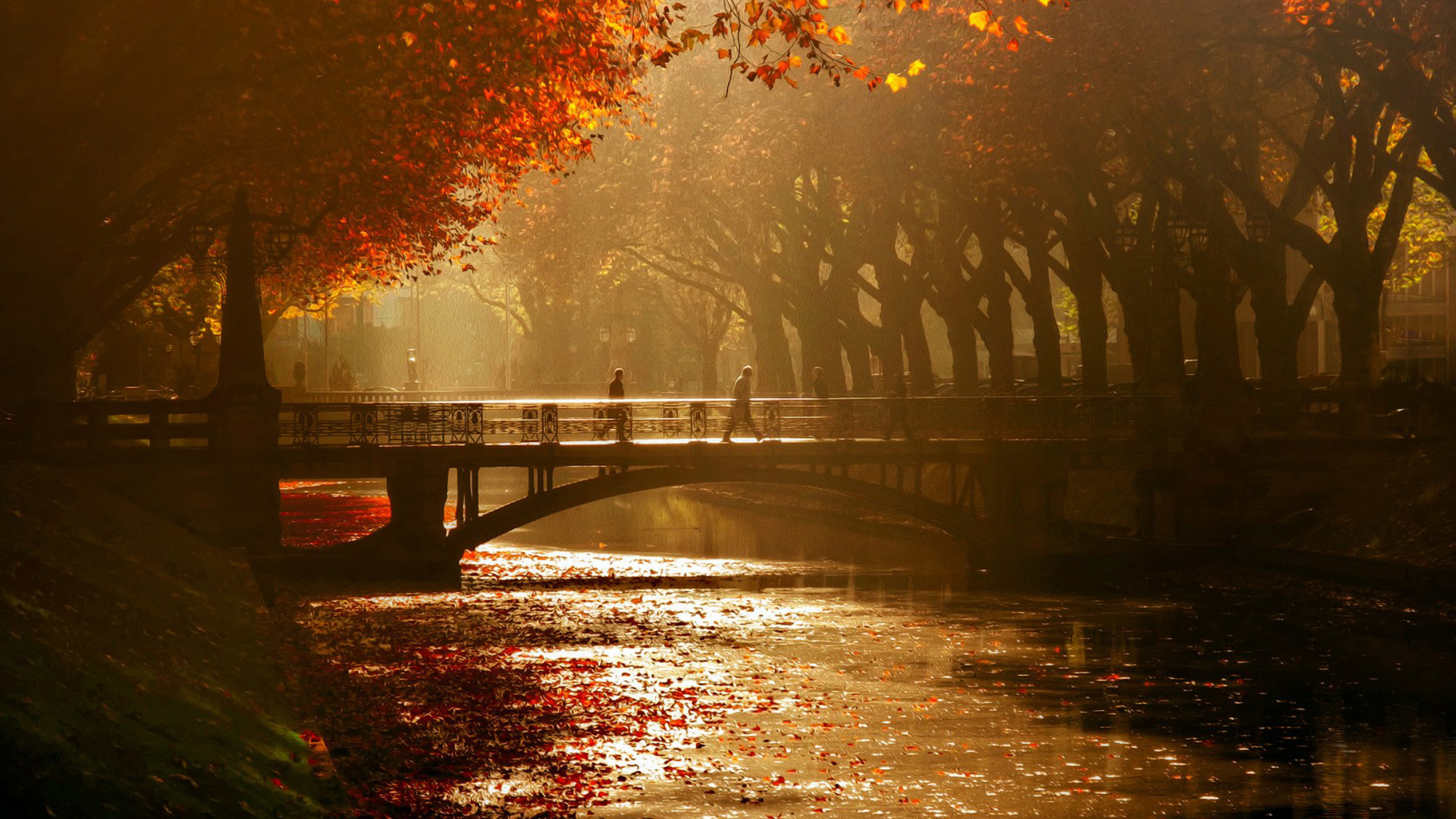 拱桥河灯树交织的美丽风景桌面壁纸免费下载