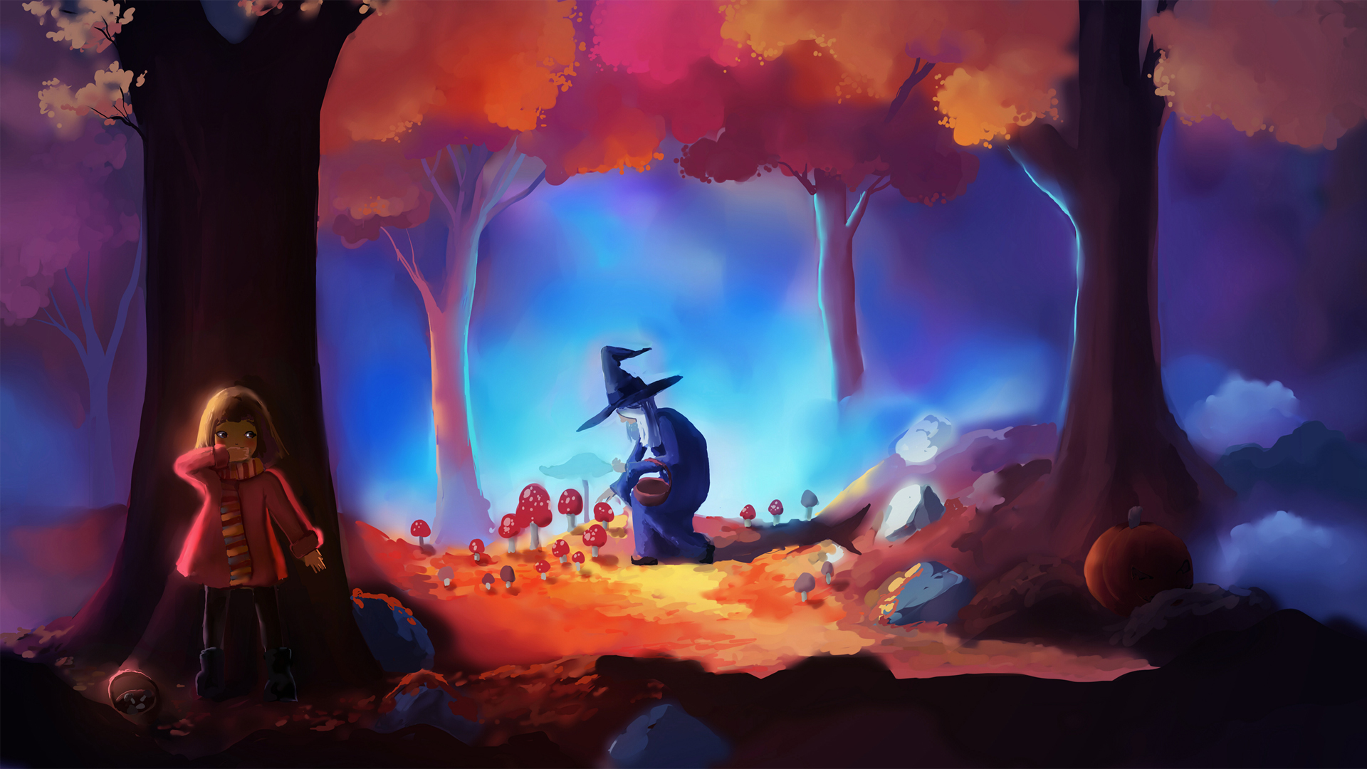 2019万圣节晚上森林动漫壁纸,小女孩蘑菇与女巫免费电脑壁纸下载
