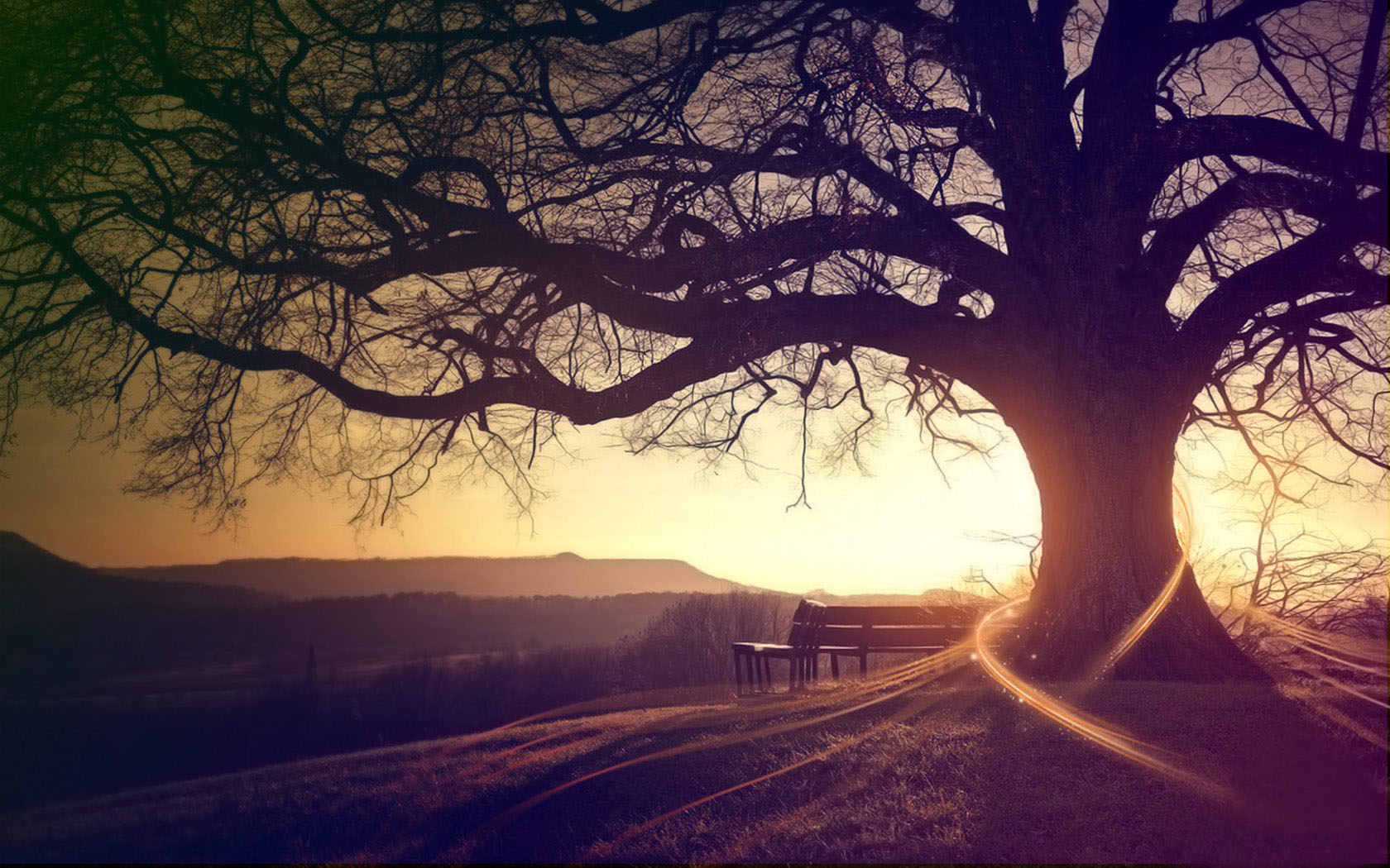 蓝色风景一棵树倒映河水夕阳月亮风景桌面壁纸免费下载