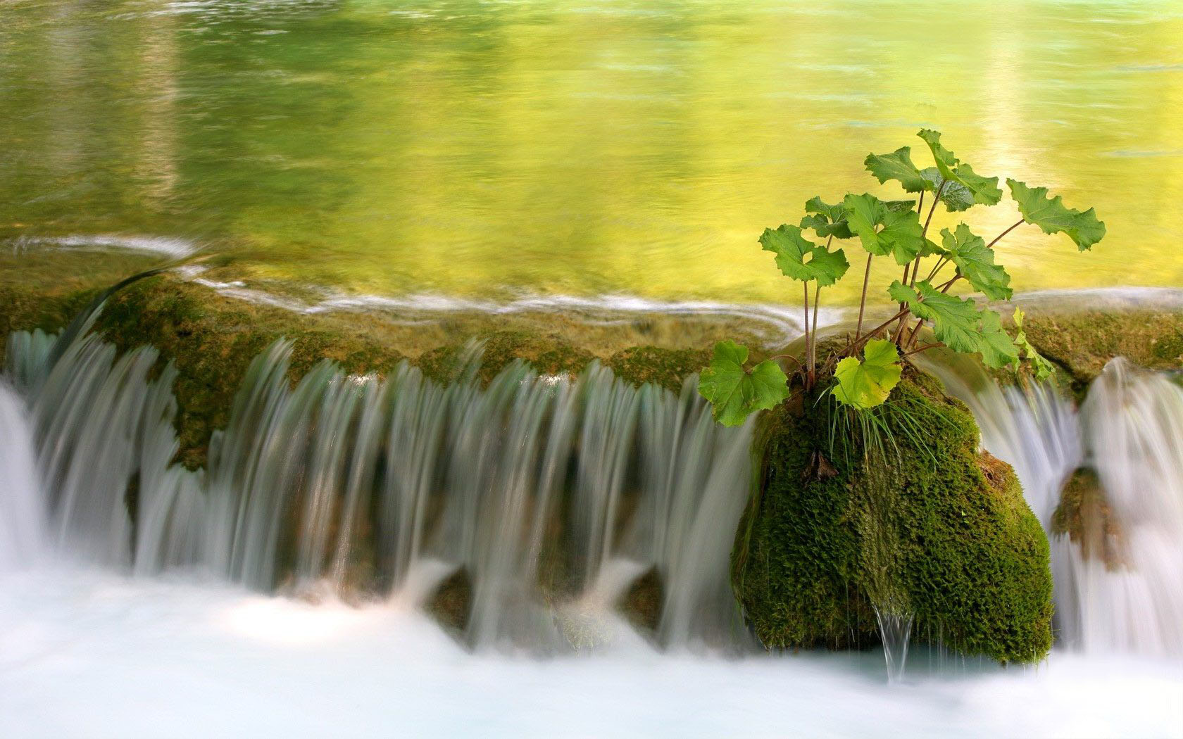 护眼高清电脑壁纸,绿色树叶伞缀水珠风景免费下载