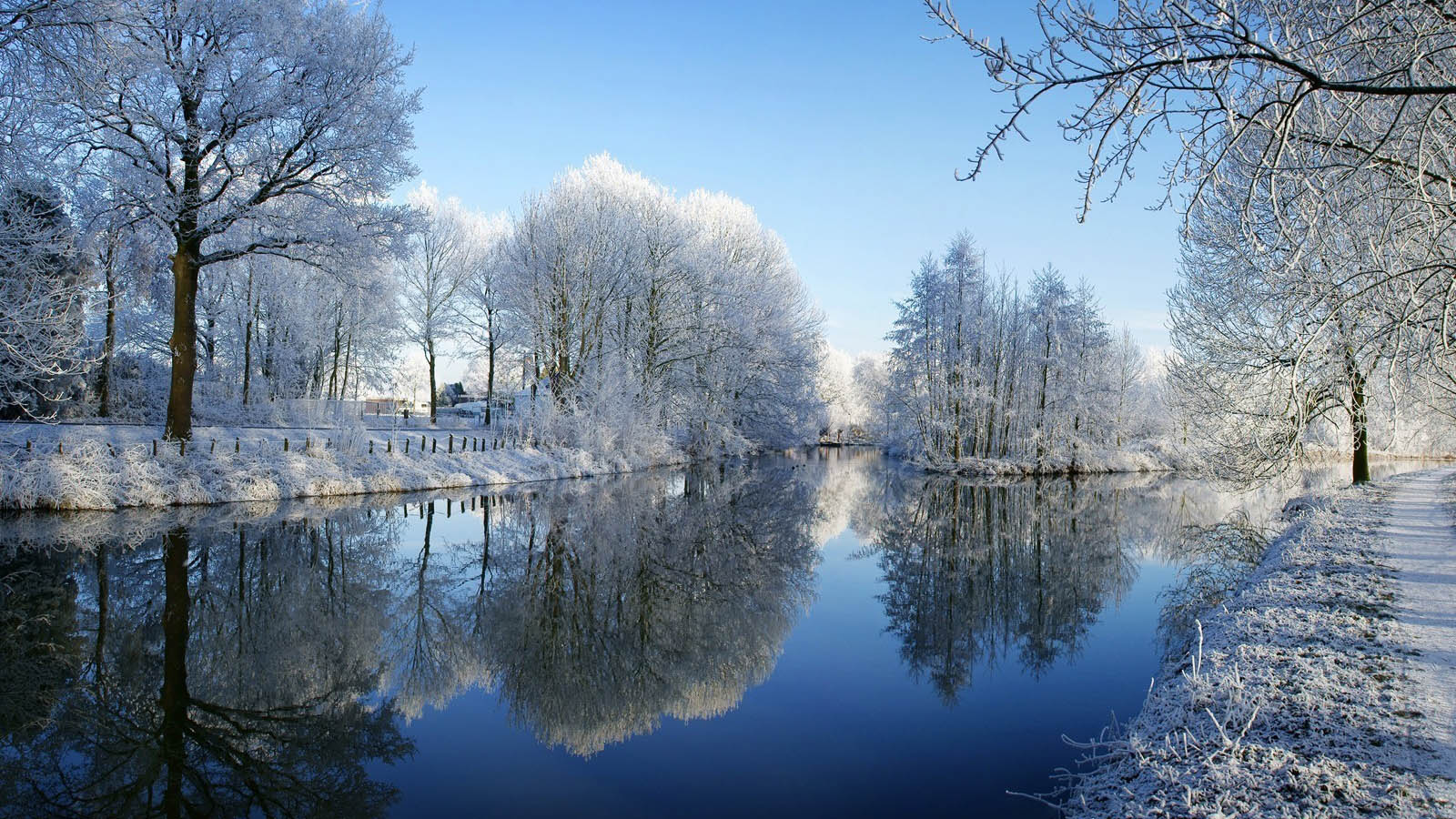 冬季雪景山间道路与房子风景免费电脑壁纸下载