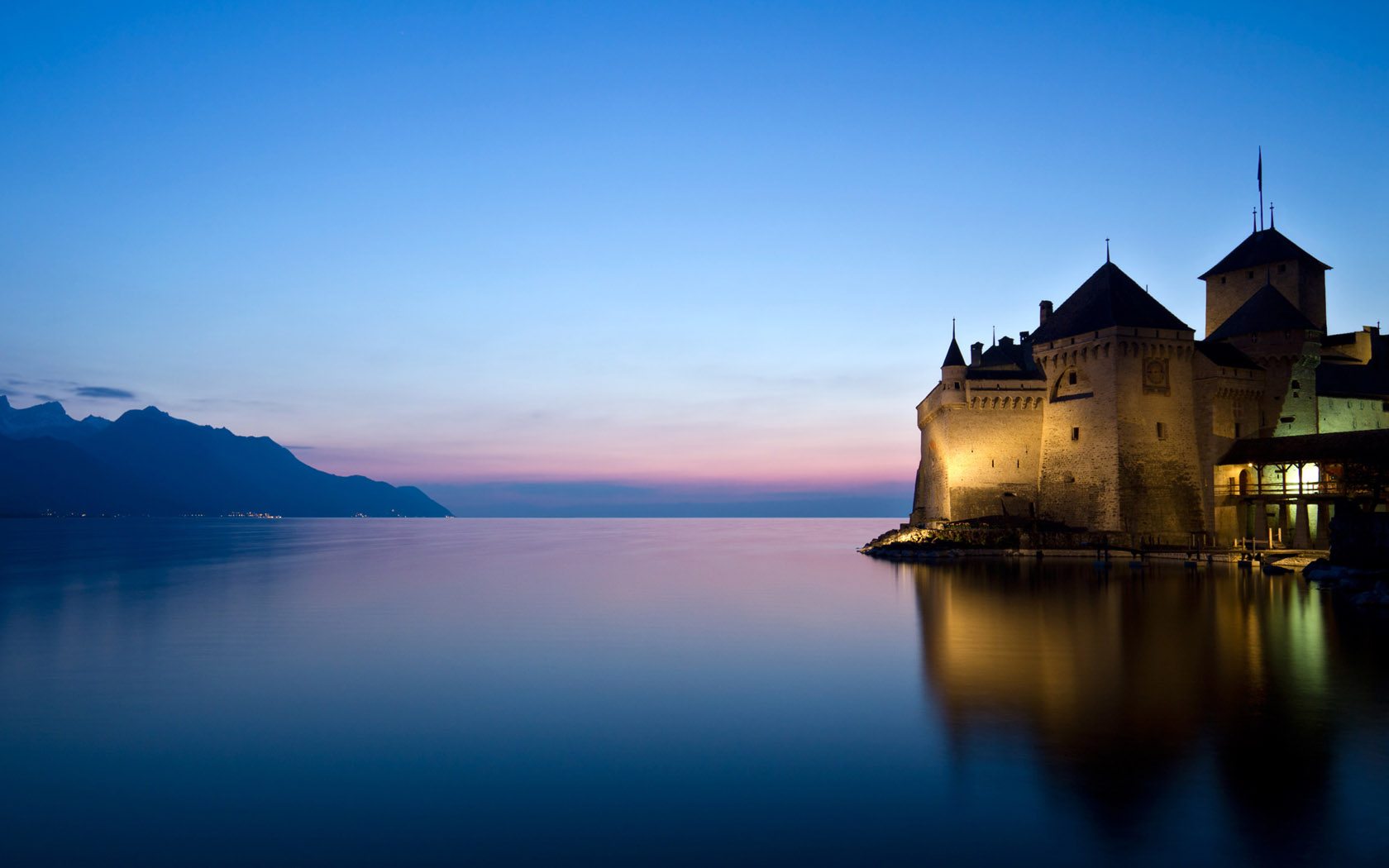 湖泊房屋树木灯光水中的倒影风景壁纸免费电脑下载