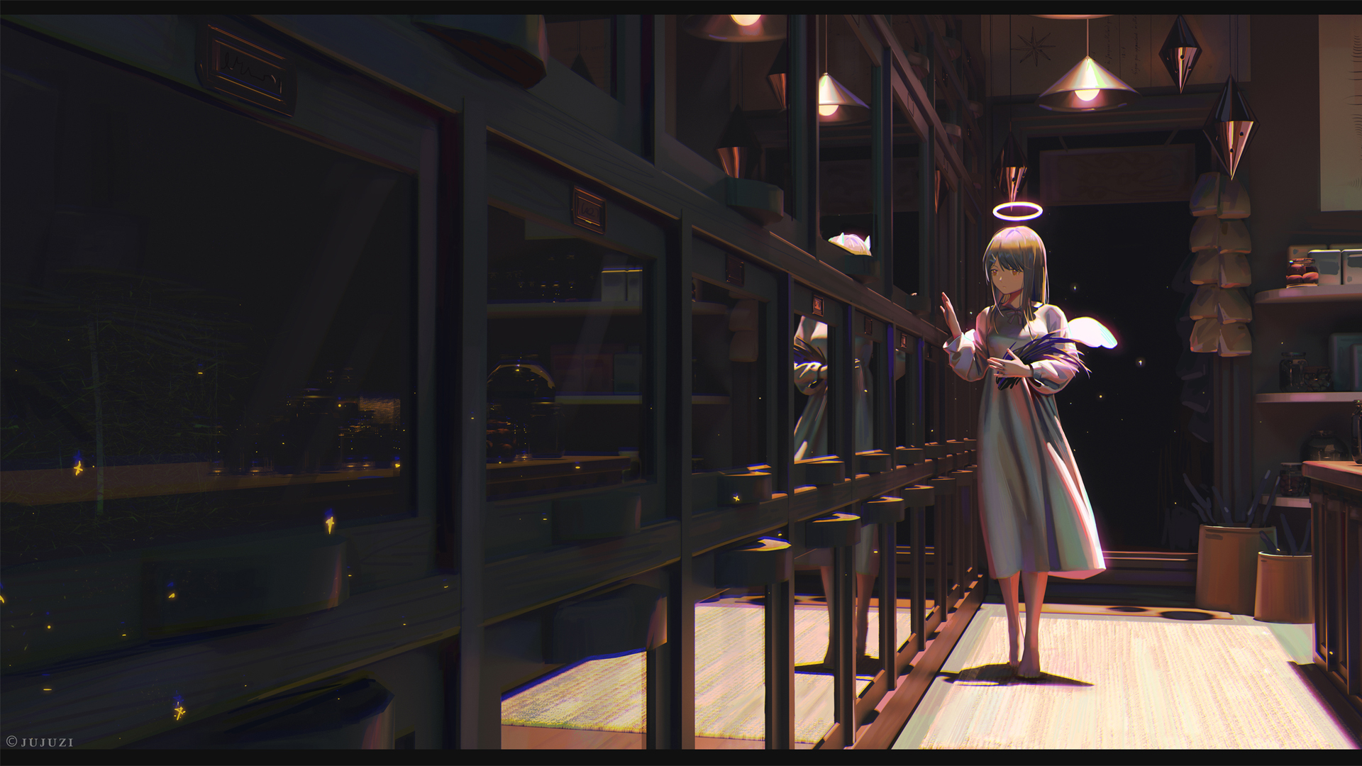 夜晚房间窗边沙发上的可爱女孩与玩具熊动漫电脑壁纸免费下载
