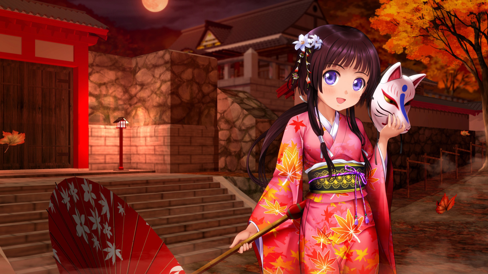 可爱秋天女孩与猫枫叶动漫壁纸 免费电脑壁纸下载