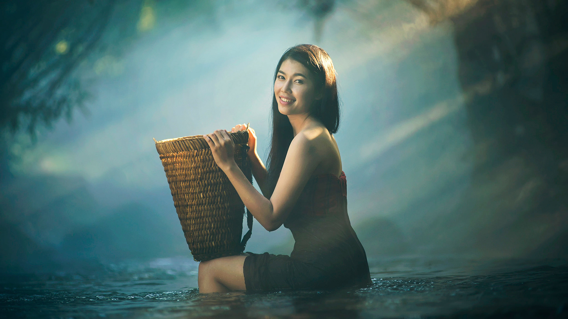 白色古装美女古风小溪瀑布风景电脑壁纸免费下载