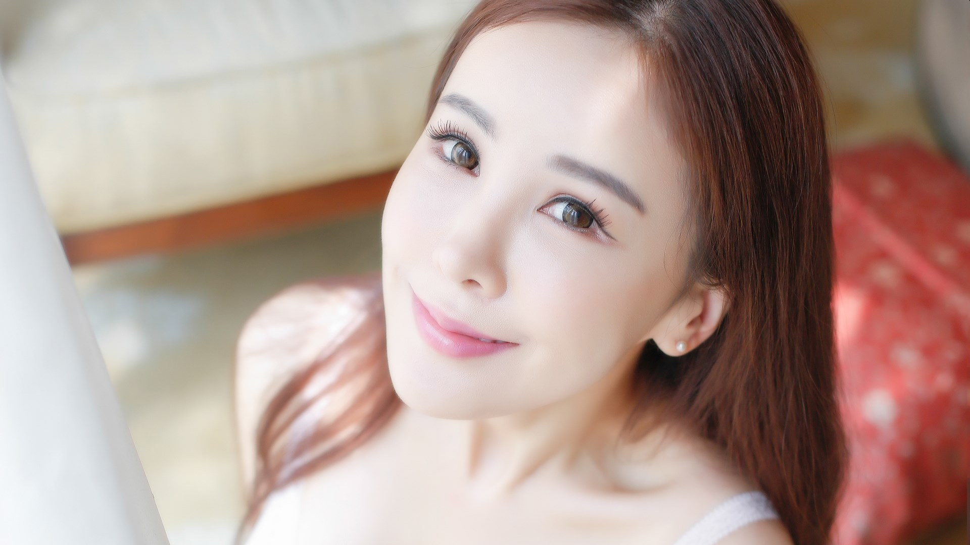 时尚发型粉红色低胸无肩裙气质美女电脑壁纸免费下载