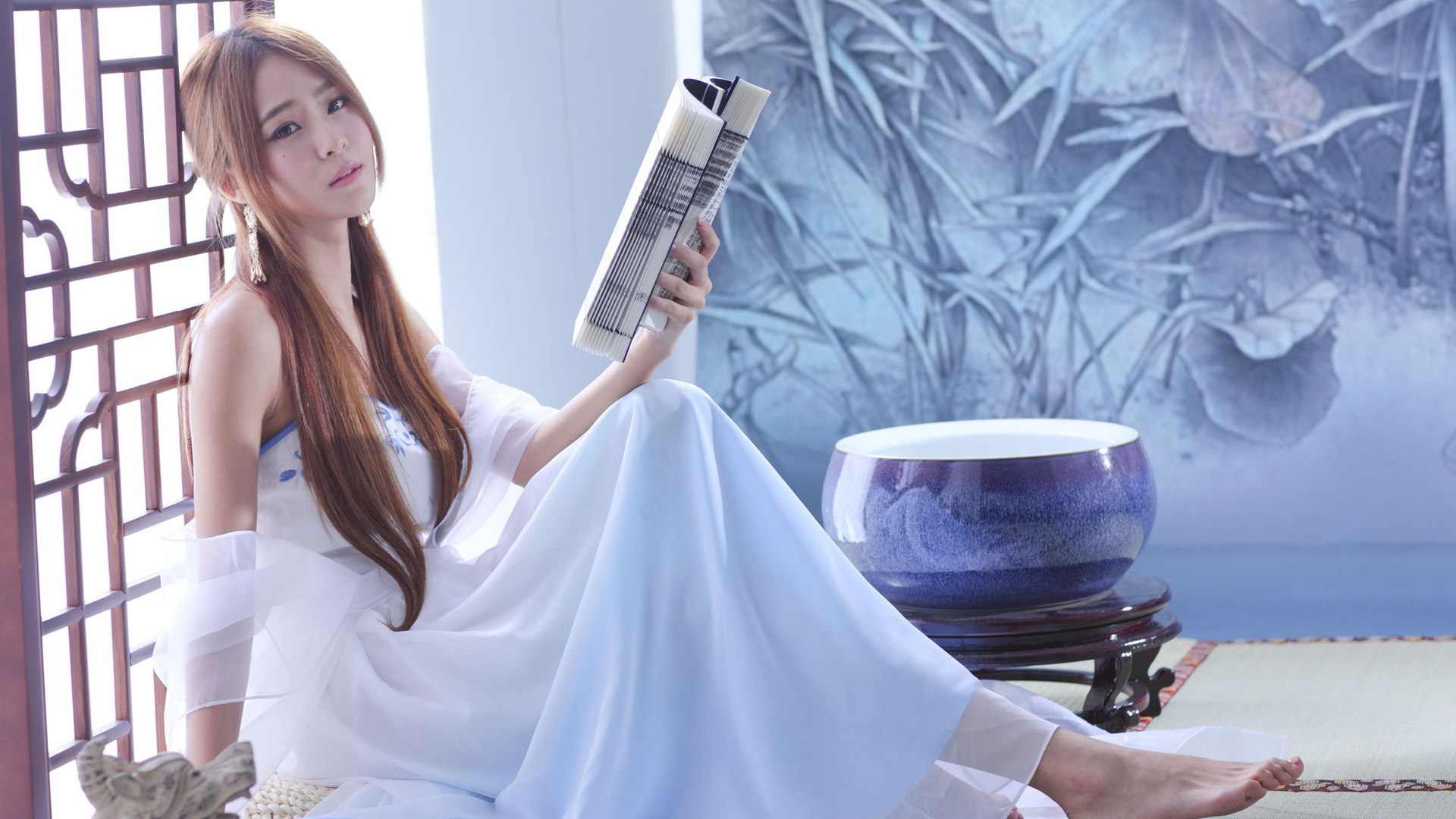居家清纯美女书主题免费电脑壁纸下载