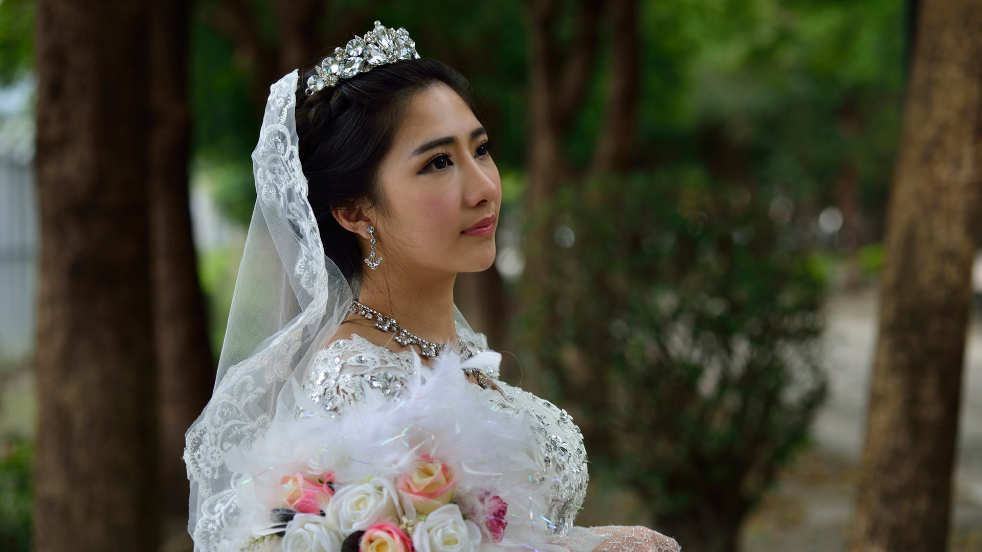 新娘微笑结婚照 美丽绿色花园鲜花美女免费电脑壁纸下载