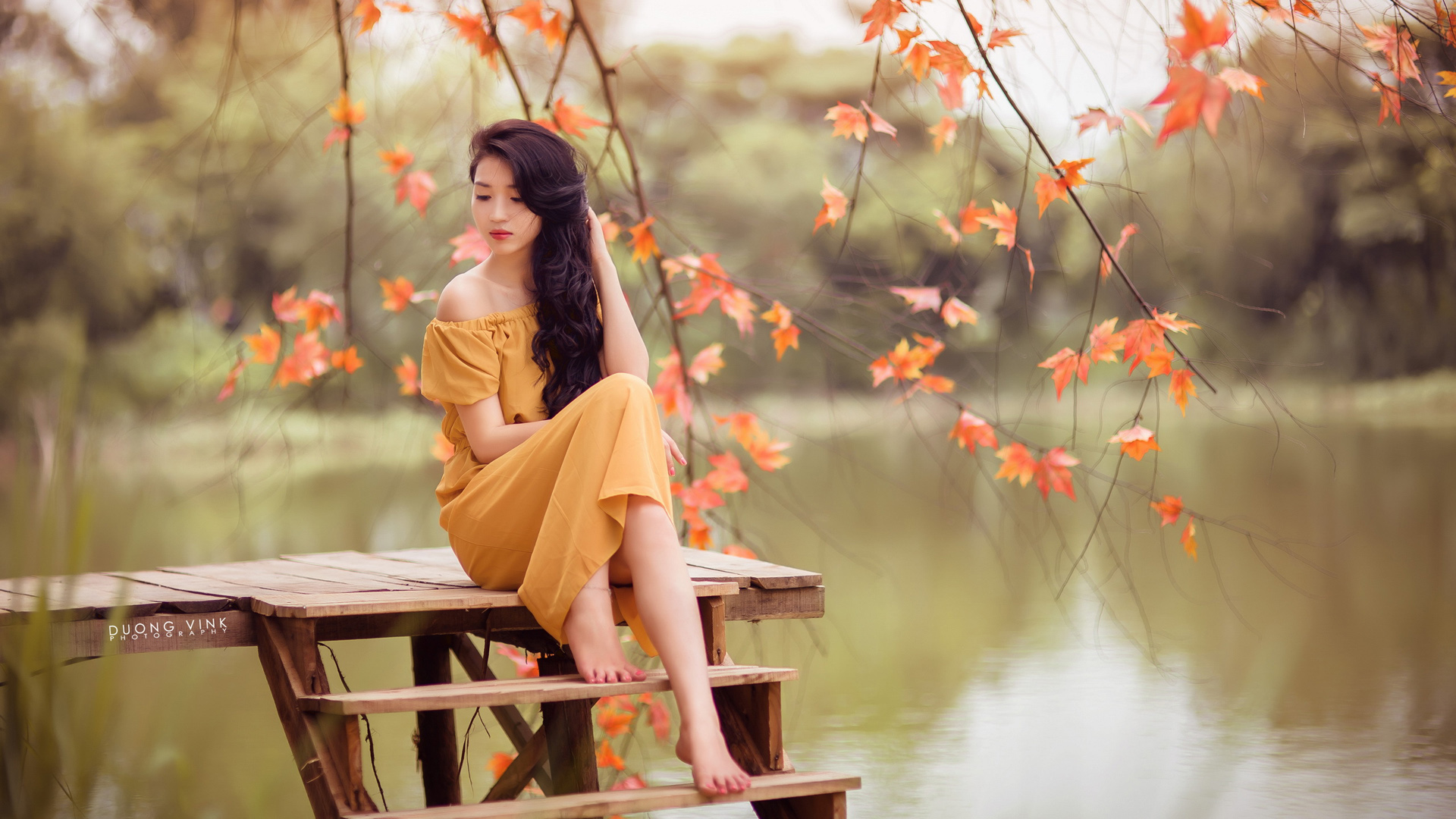 秋天道路旁粉色礼服唯美漂亮女孩美女电脑壁纸免费下载