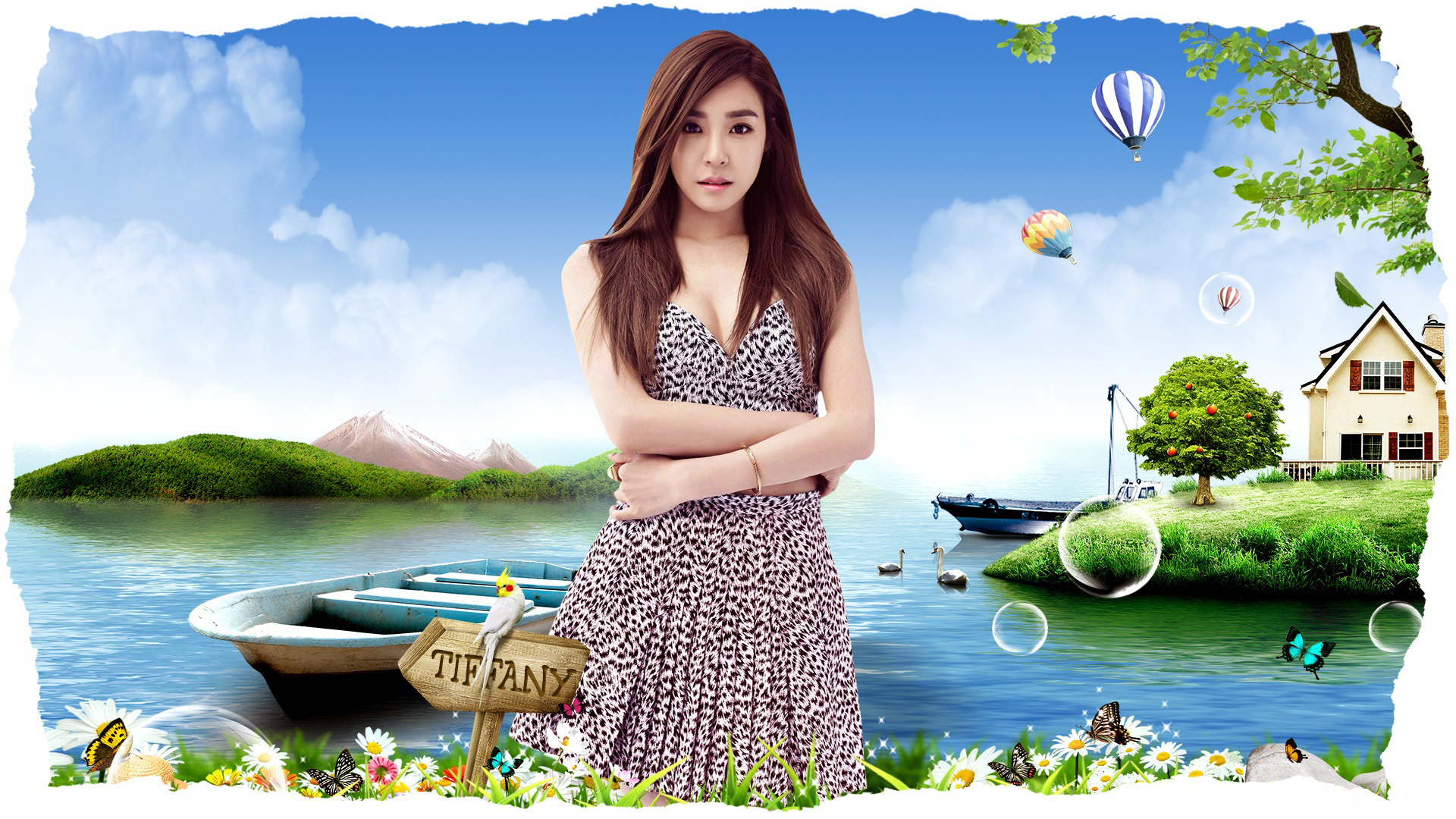 黄美英湖畔性感裙装家园山景小船花草唯美梦幻美女电脑壁纸免费下载