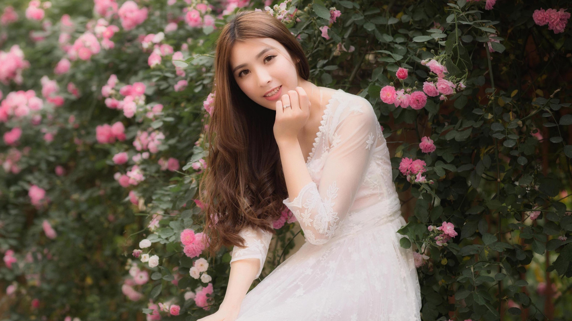 花园芭蕾背景下的靓丽美女高清桌面壁纸免费下载