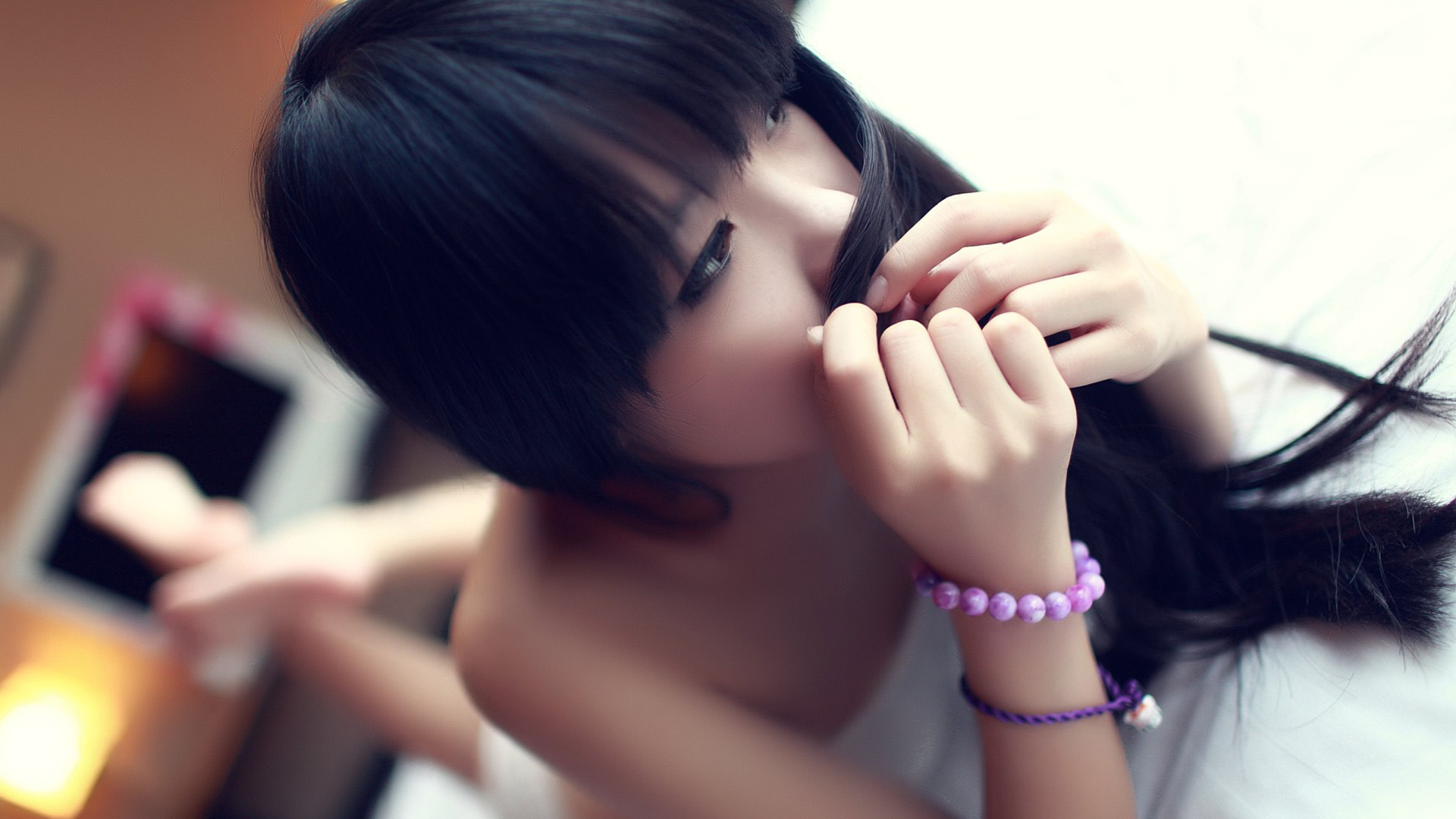 温心Swan白色睡衣嘟嘴卖萌居家照 免费电脑美女壁纸下载