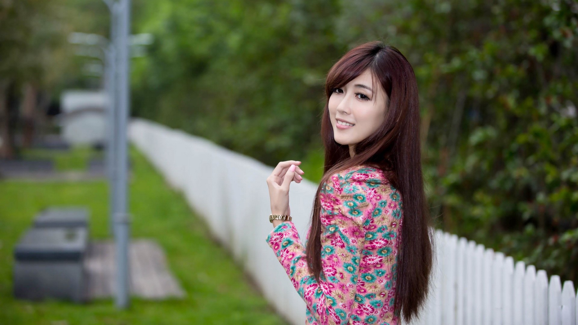 新娘微笑结婚照 美丽绿色花园鲜花美女免费电脑壁纸下载