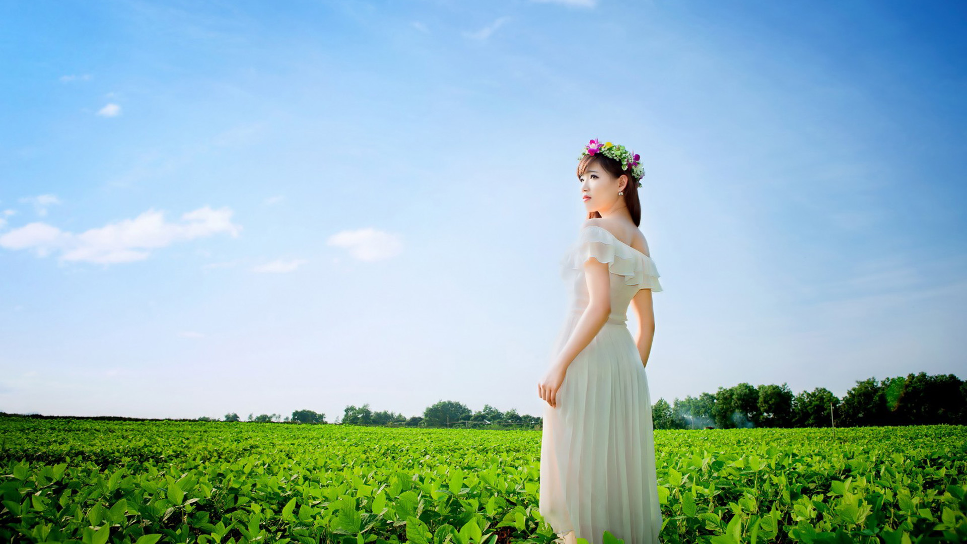 美丽女孩白色裙子可爱姿势摄影高清免费电脑壁纸下载