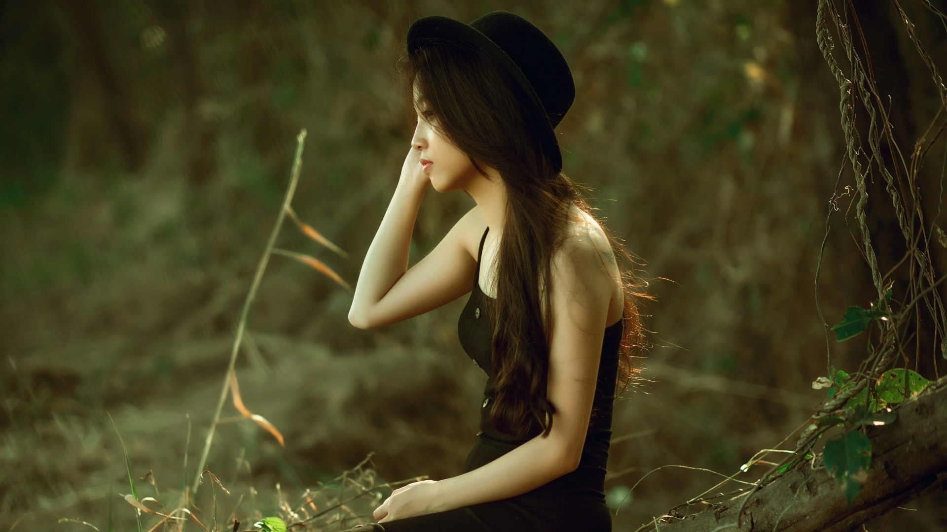 闭眼黑发黑衣美女写真免费电脑壁纸下载