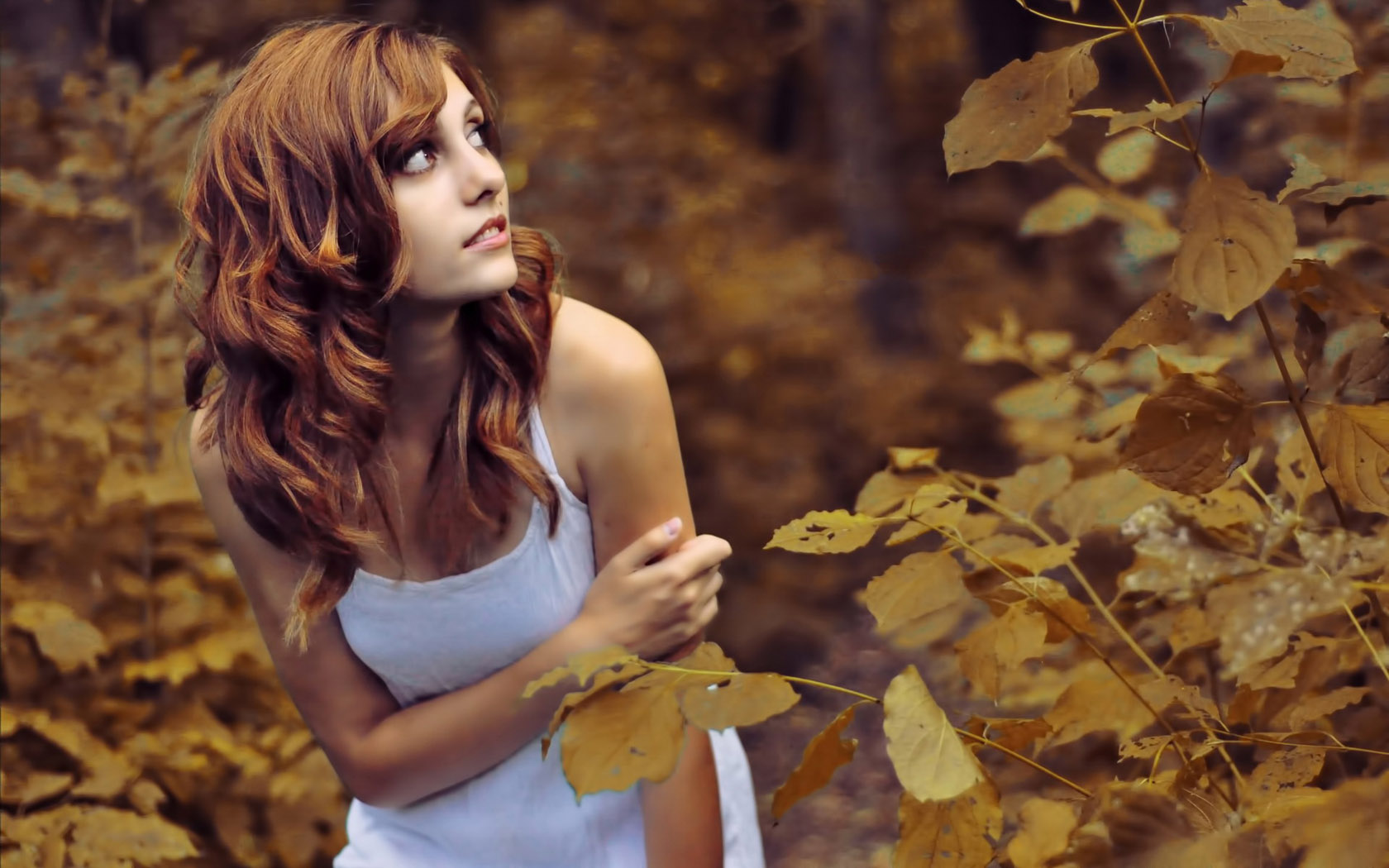 森林树畔休息 穿白色礼服裙子的唯美美女免费电脑壁纸下载