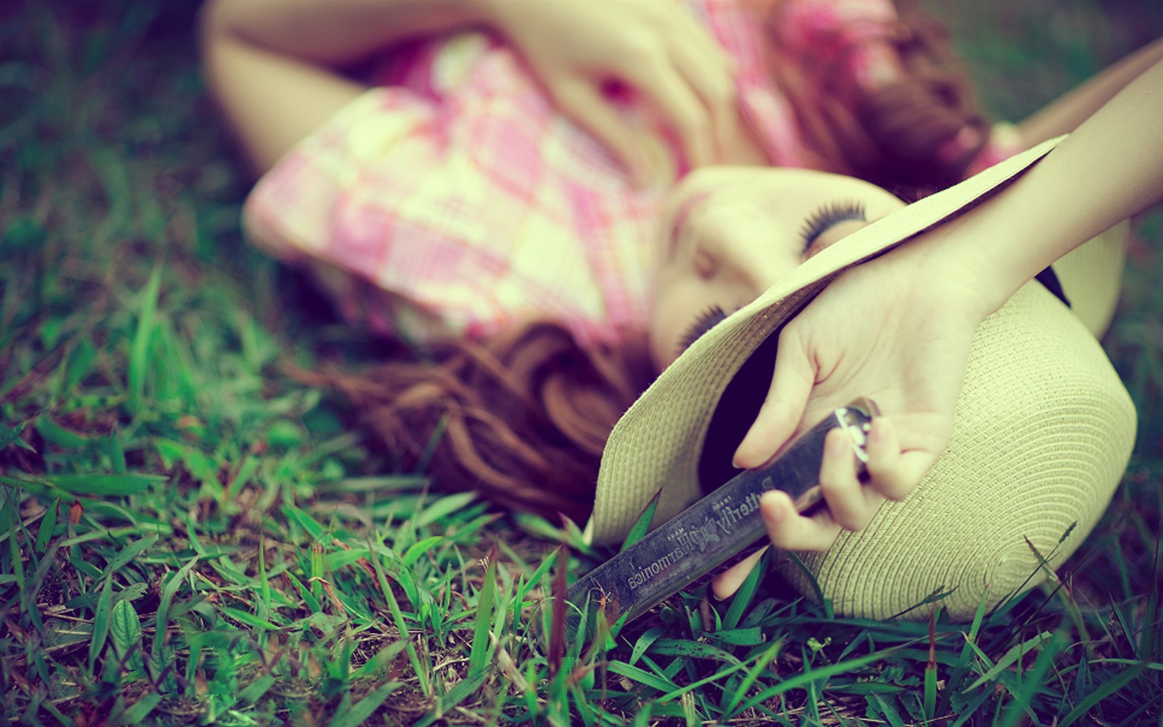 睡在桃花林草地上的清秀少女 免费高清电脑壁纸下载
