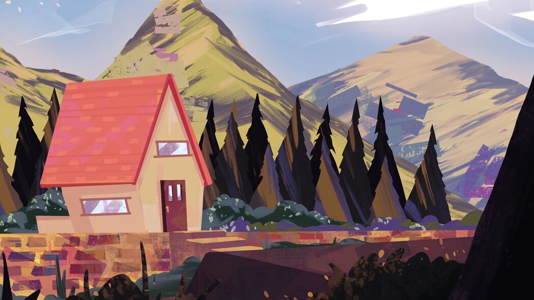 天空 云朵 房屋 树木 台阶 2D绘画风景 4k壁纸