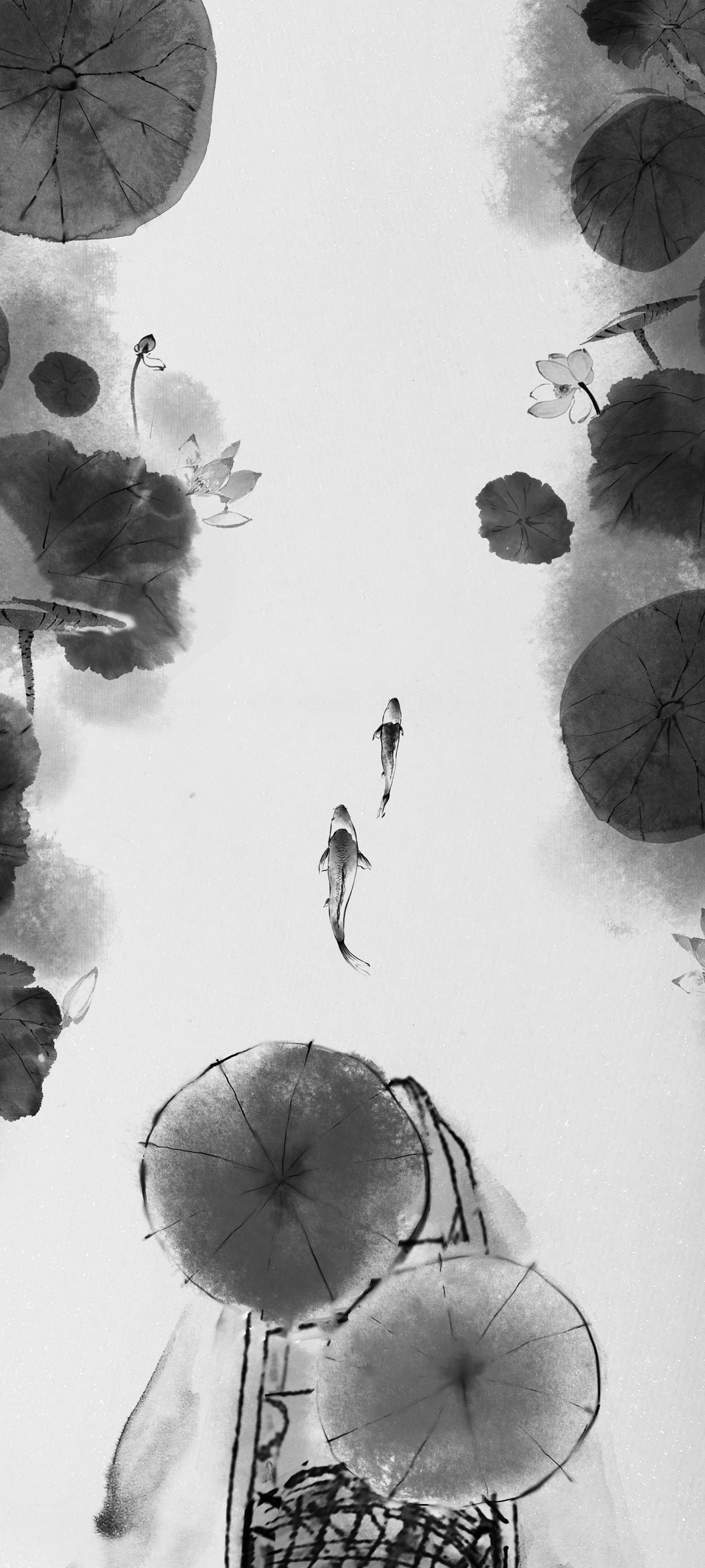 水墨古风 荷塘 鱼 黑白 手机壁纸